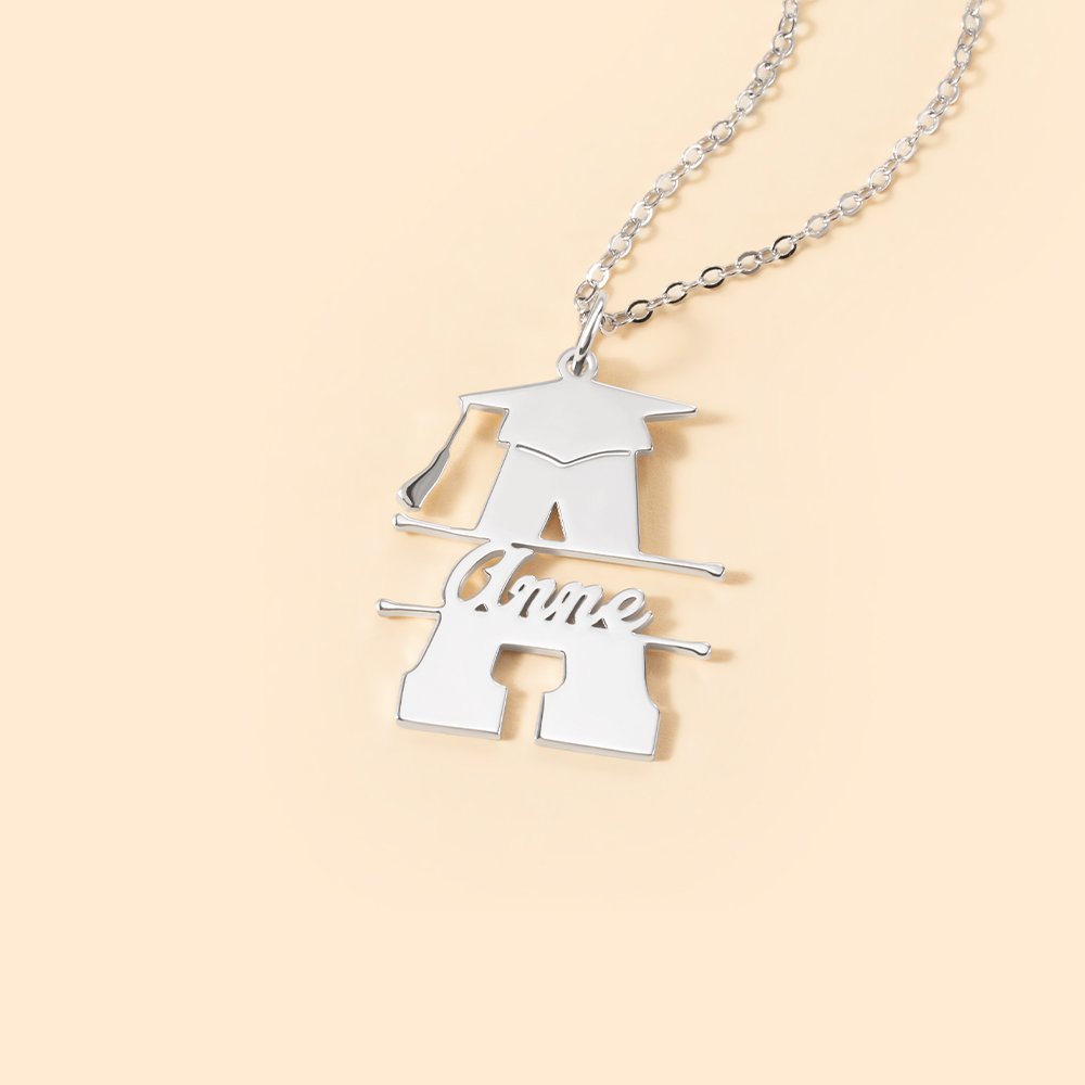 This necklace features a design of a graduation cap adorned with an initial and can be customized with your name. It beautifully combines elegance and personalization, making it a standout piece of jewellery that celebrates your achievement.