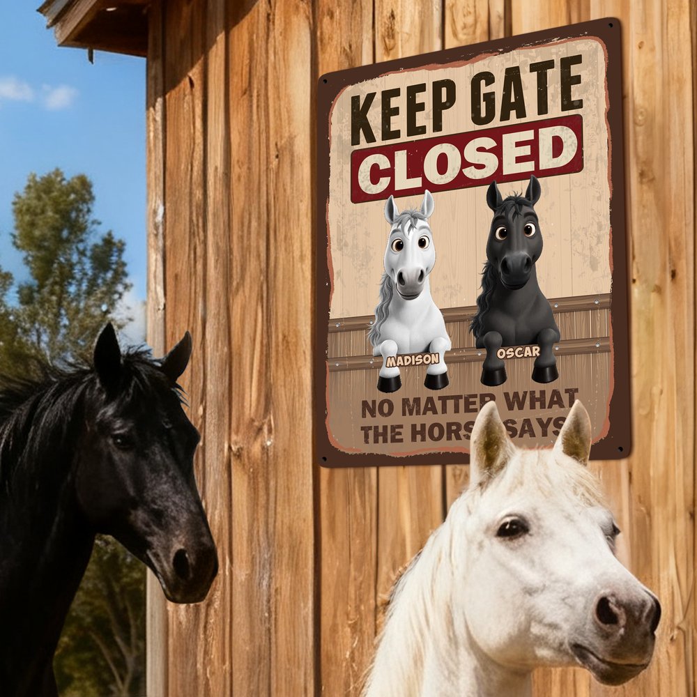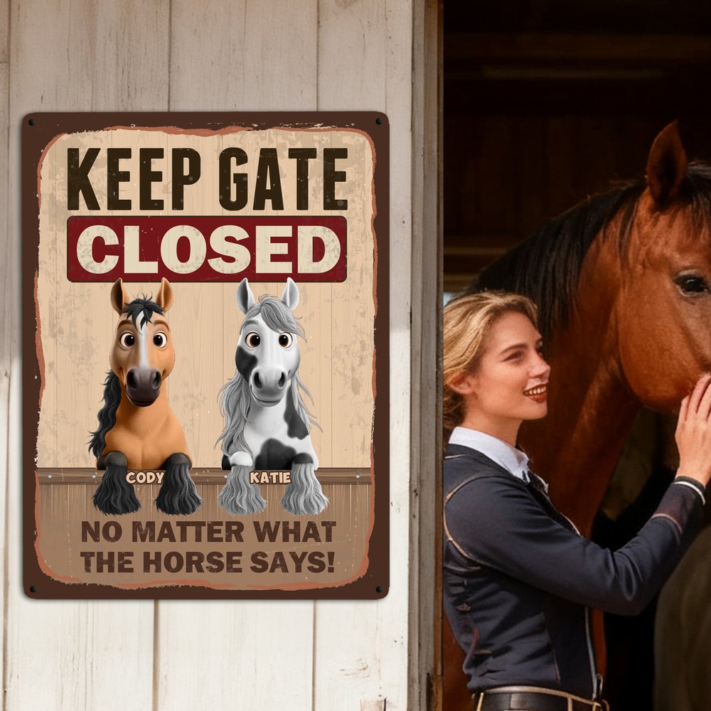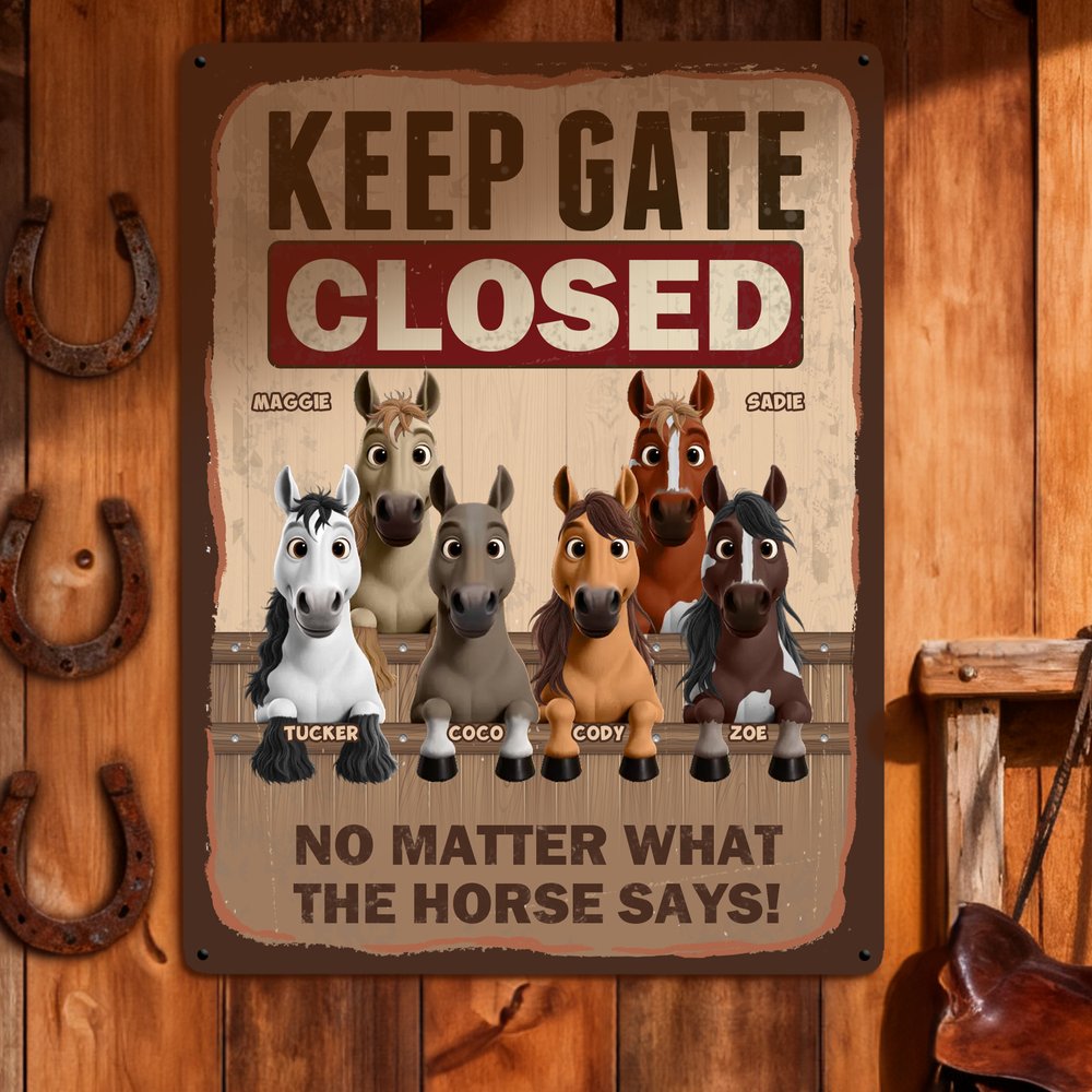 This vintage-style horse tin sign features a customizable 1-6 cartoon horse design each with a unique, playful appearance paired with names. It blends a weathered wood-texture background, the humorous slogan “KEEP GATE CLOSED / NO MATTER WHAT THE HORSE SAYS!” and vibrant, kid-friendly horse illustrations—turning a functional sign into a personalised, whimsical farm decor piece.