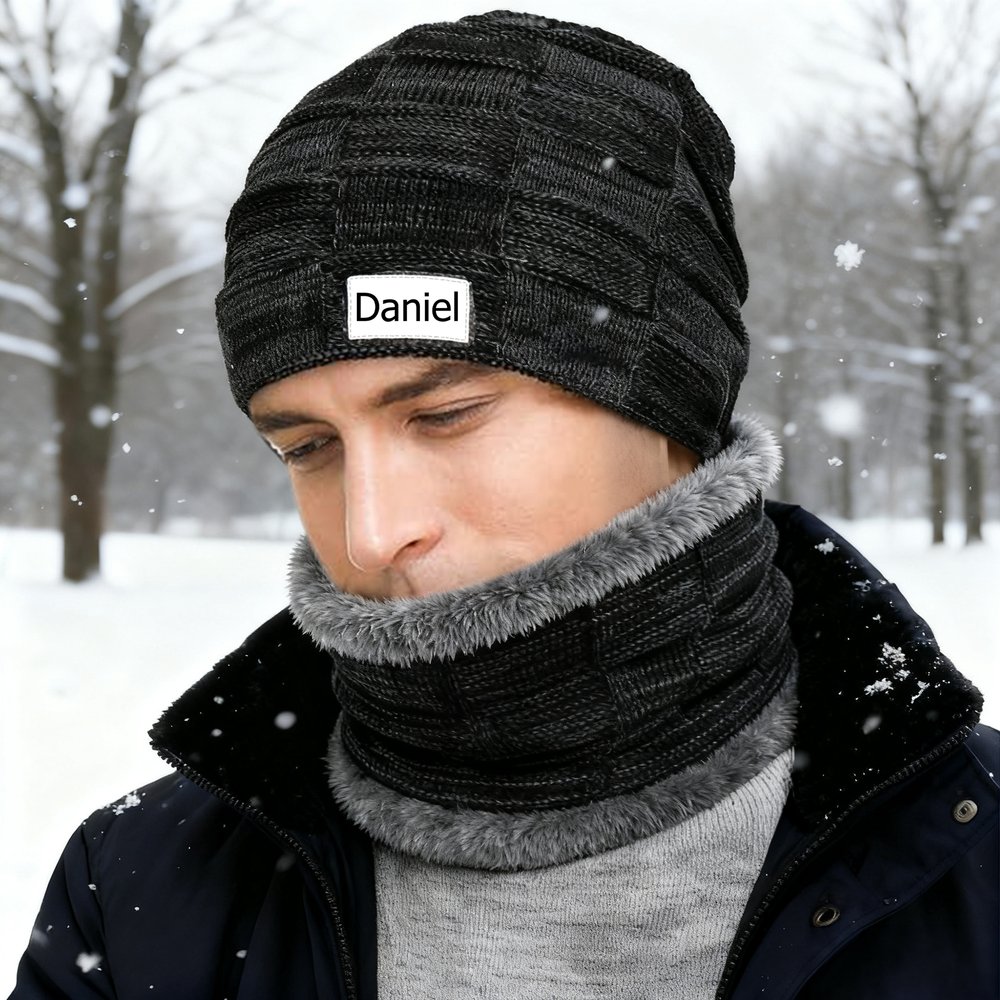 Personalised Knitted Slouchy Beanie Hat and Neck Warmer Set with Name Thick Outdoor Activity Accessory Birthday Christmas Gift for Men Women