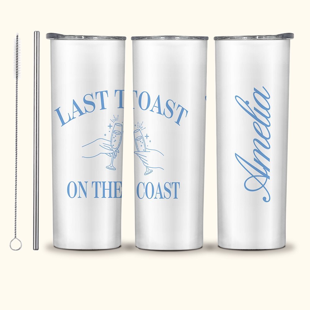 Our tumbler is truly unique because the Personalised option of adding your name makes it unique. The Text "Last Toast On The Coast" and the cheers pattern add a playful and cheerful atmosphere to any celebration.