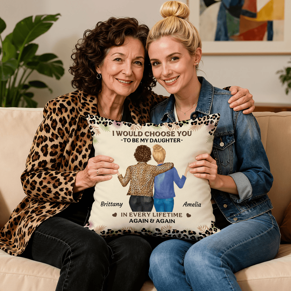 This design centres on a cartoon illustration of a mother and daughter embracing, accompanied by the touching line: “I WOULD CHOOSE YOU - TO BE MY DAUGHTER - IN EVERY LIFETIME AGAIN & AGAIN”.Framed by a playful leopard print and tropical leaves, it can be personalised with hairstyles, clothing, and names, turning every detail into a cherished memory that’s both sweet and stylish.