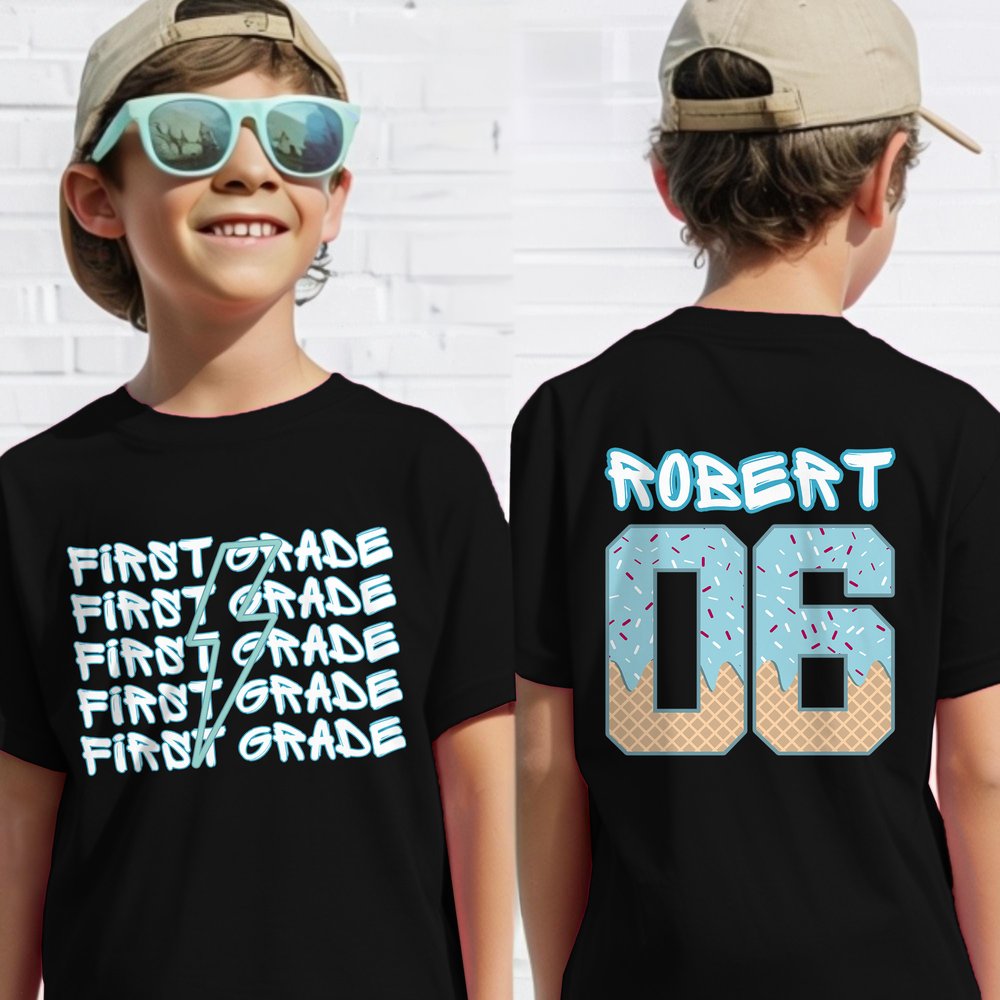 This kid's T-shirt offers Personalised customization options. You can add the child's name, the grade they are entering, and a number in a droplet ice cream motif—a fun element that fits well with baseball themes. Additionally, the design features a lightning element on the front, making each T-shirt unique and making kids feel special.