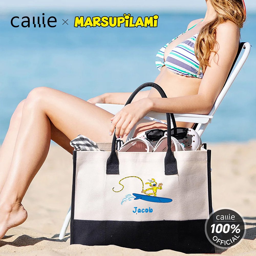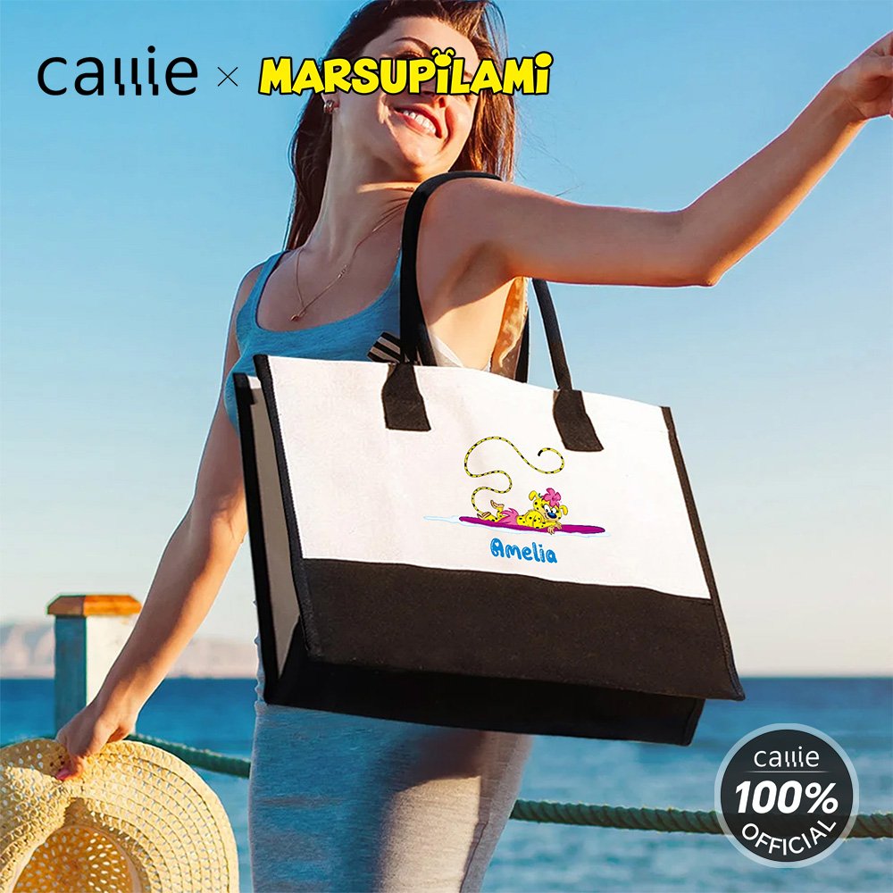This tote bag features a collaboration with the renowned IP Marsupilami, created by Belgian cartoonist André Franquin in 1952. Marsupilami is a jungle-dwelling creature with yellow fur, black spots, and a super flexible, long tail. Our design incorporates vibrant and dynamic surfing scenes, showcasing the power and beauty of the ocean, along with the enchanting charm of the beach. You can choose your favorite Marsupilami character and customize it with your name, making each tote bag a unique piece of art that perfectly reflects your personality and style.