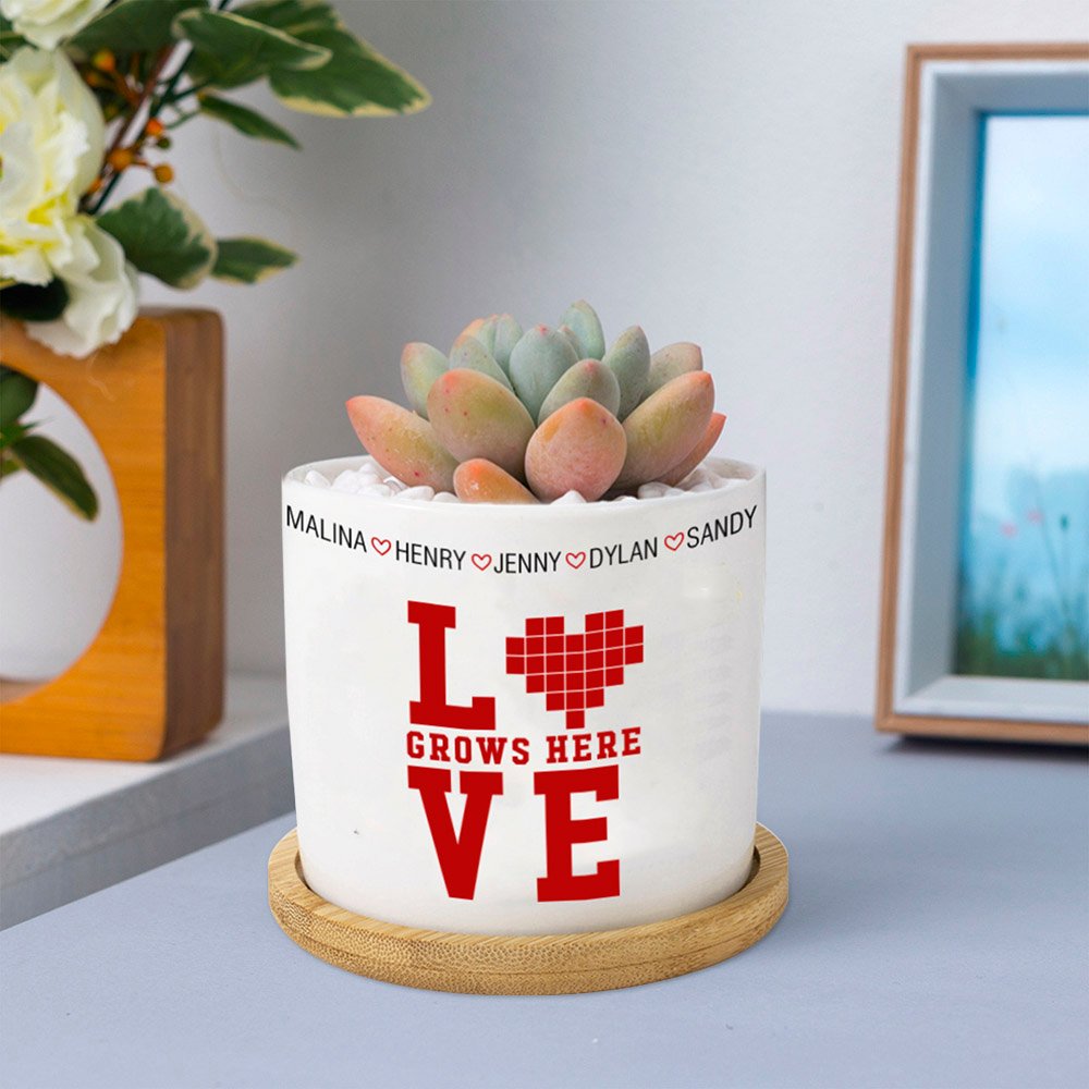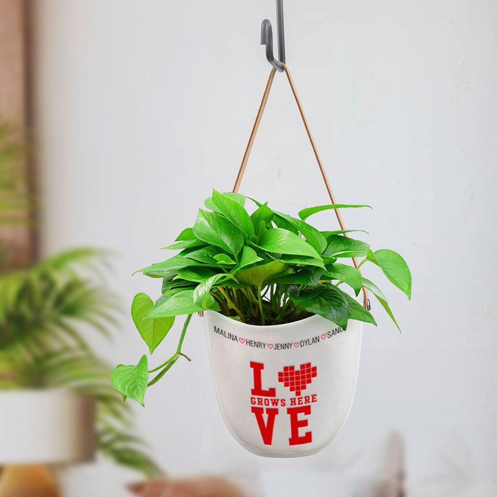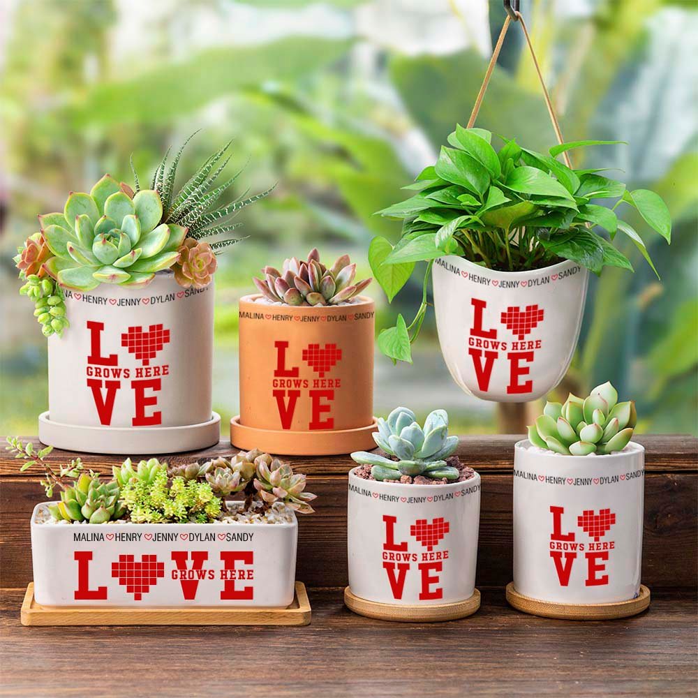 Our Personalised Love Grows Here flower pot is the perfect gift to show your love and appreciation to grandparents or mothers. The central theme of "Love Grows Here" is beautifully printed on the pot, while 1-20 names are connected with red hearts and printed along the front top of the flower pot, symbolizing the unity and growth of a family.
