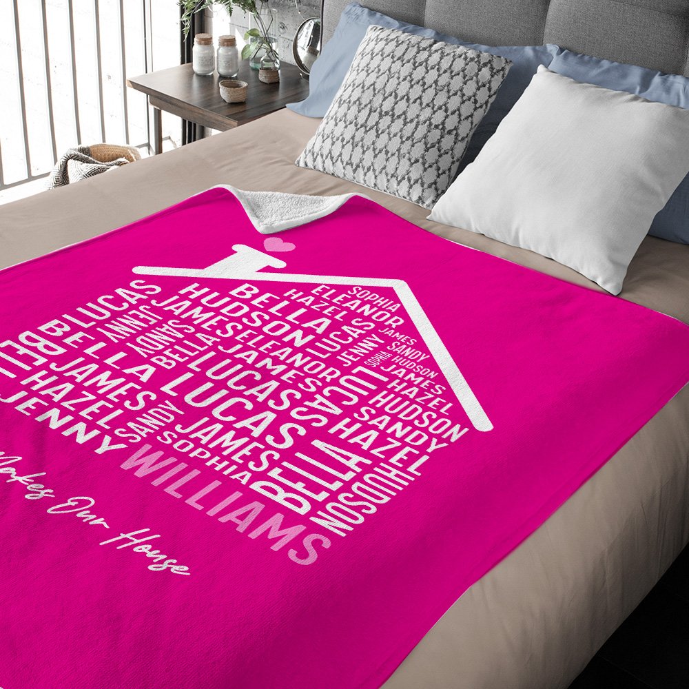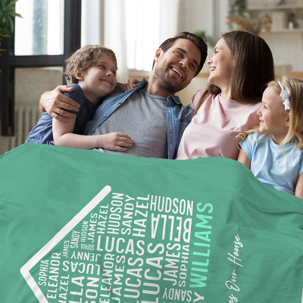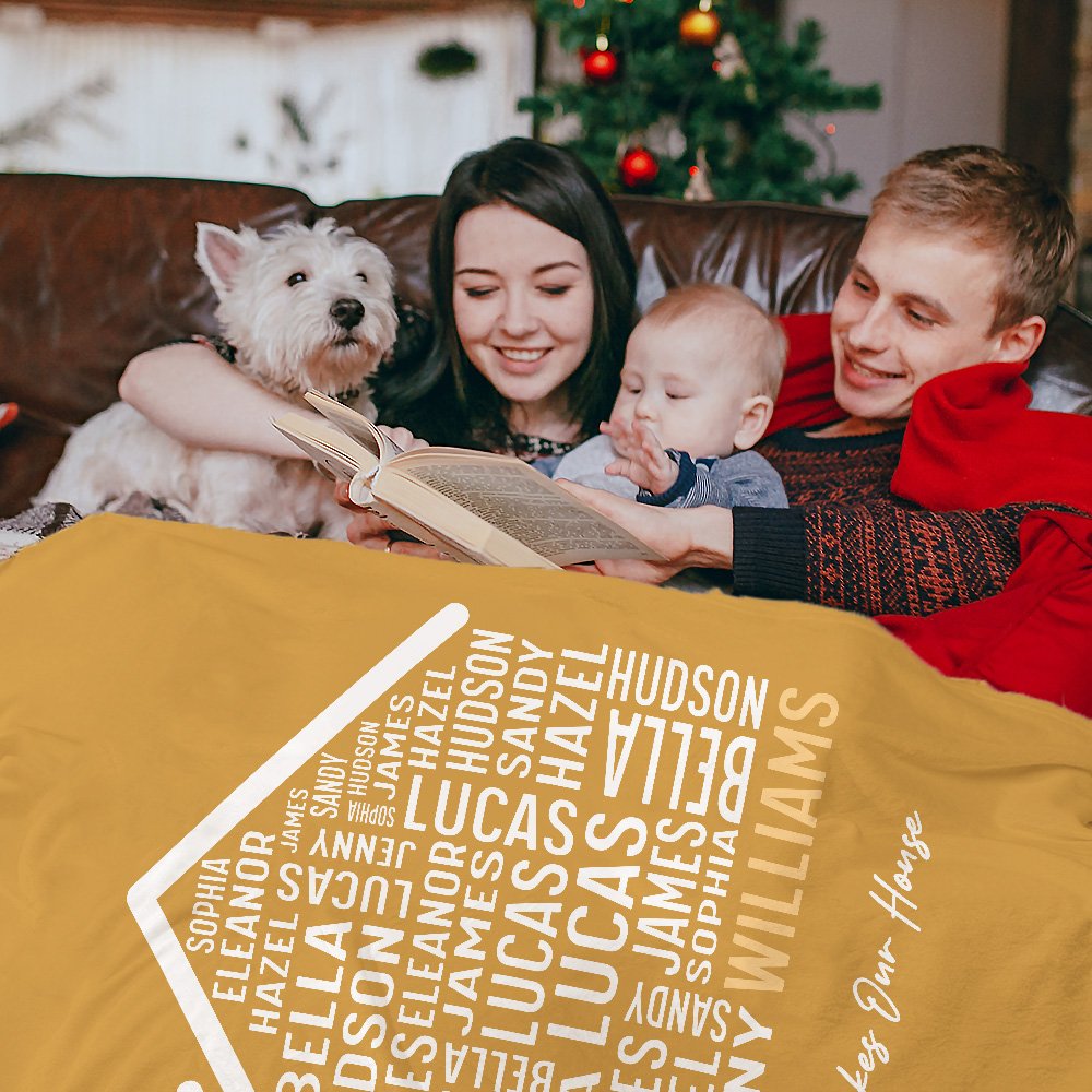 Our family house name blanket can be customized with 1-35 family member names and a special text, creating a unique and heartfelt family blanket gift that will be cherished for years to come.