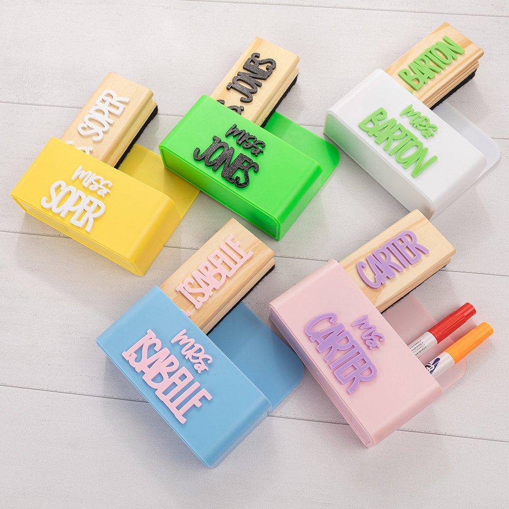 This marker pen holder features a sleek and minimalist design in six vibrant colours, seamlessly blending into any classroom environment. It enhances organization, reduces confusion, and saves valuable time while projecting a professional image for teachers. Personalise it with the teacher's name to add a unique touch, combining storage and nameplate functions on their desk.