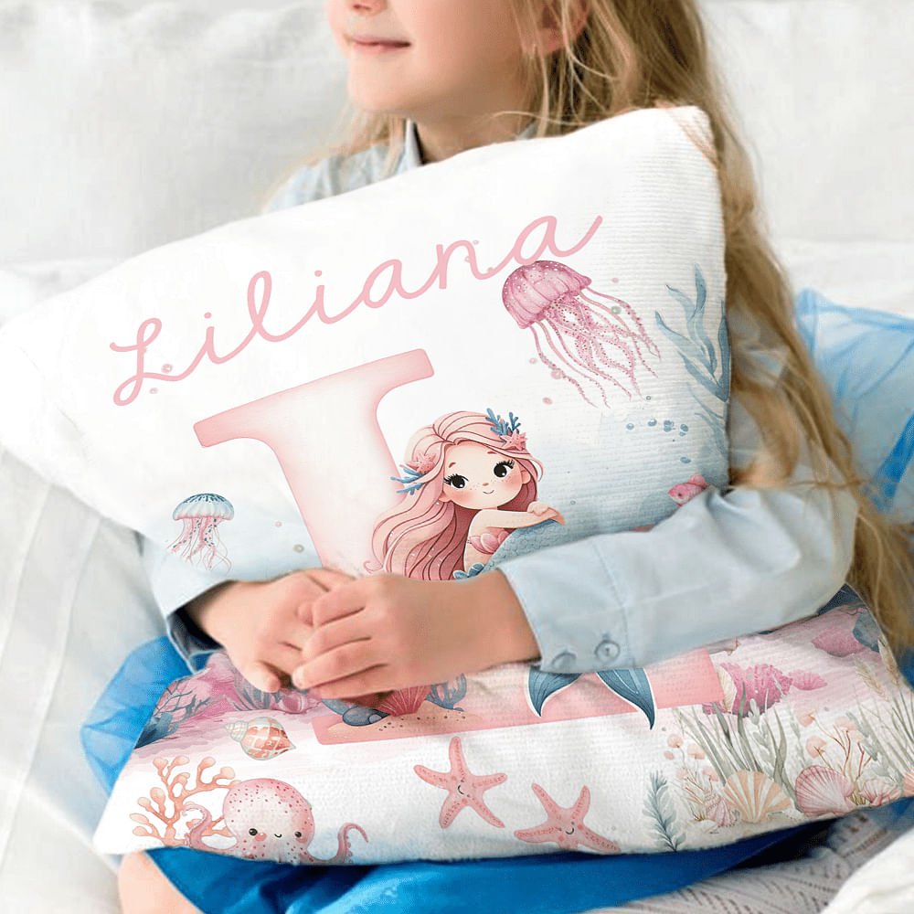 This pillowcase shows mermaids, shells, jellyfish, octopuses and other marine life in the underwater world. The bright colours make it a delightful addition to any room. Featuring initial and name customization, it's perfect for creating a cozy and whimsical atmosphere in a child's bedroom or play area.
