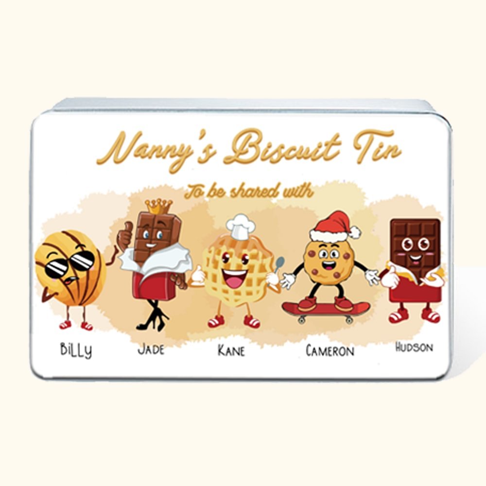 Personalised Food Grade Metal Cute Characters Biscuit Tin with Name and Text Gift for Family or Friend