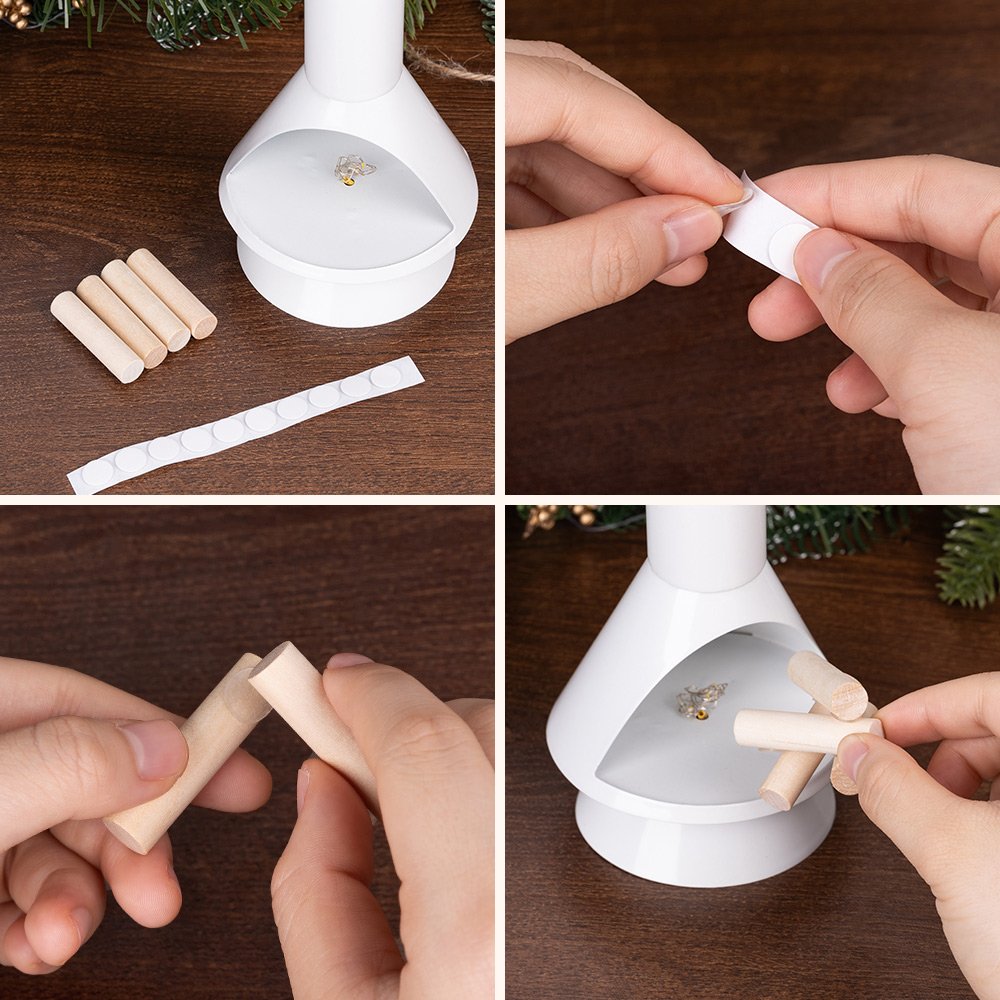 The product is supplied with double - sided adhesive tape and four miniature firewoods, allowing you to attach and position the firewoods inside the fireplace freely.