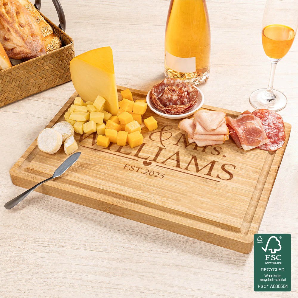 Each board is custom-engraved with the names of the couple, the establishment date, and the fixed title, Mr. & Mrs., creating a unique and personal touch. The elegant script engraving adds a sophisticated and romantic flair. Including the establishment date, such as "EST. 2024," makes it a timeless keepsake that commemorates the special year.