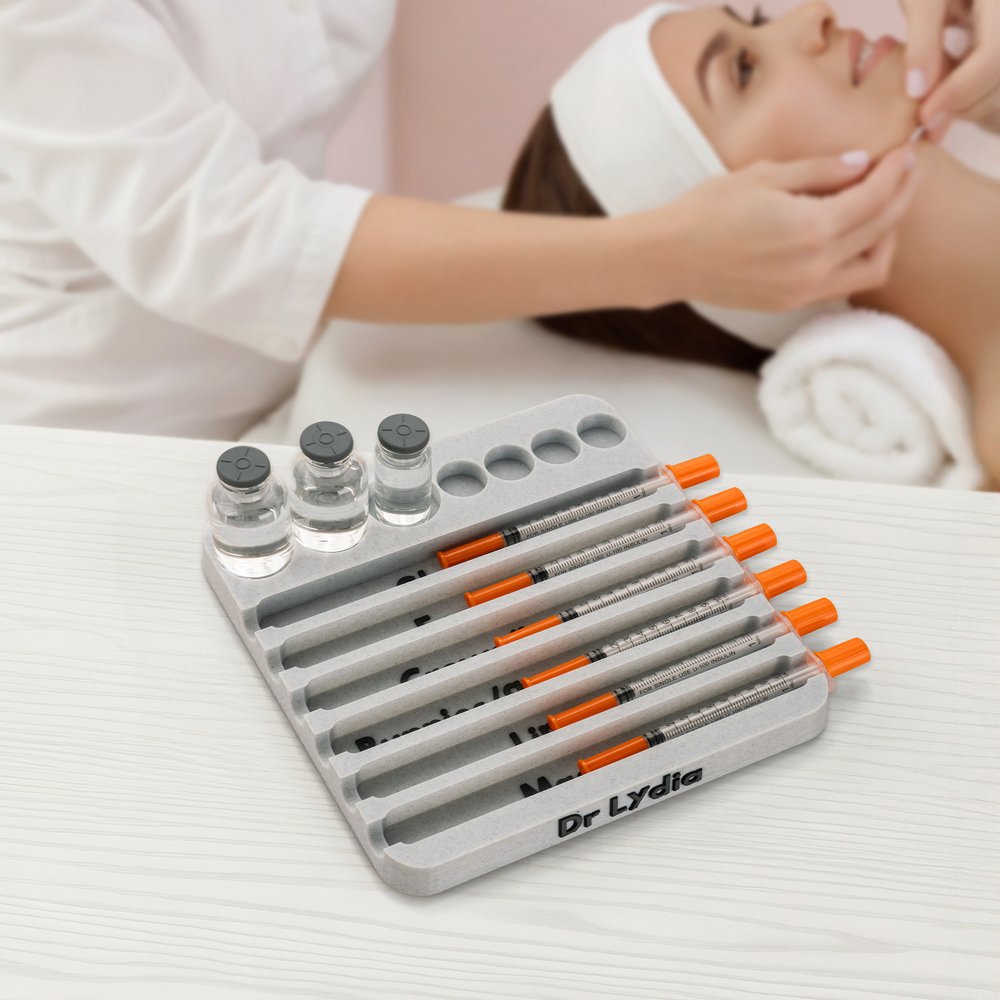 This syringe tray features a partitioned design with up to six dedicated slots, ensuring clear categorization and easy access to syringes and other tools. Custom text can be printed, such as names or organization logos, showcasing professionalism and enhancing customer trust through attention to detail.