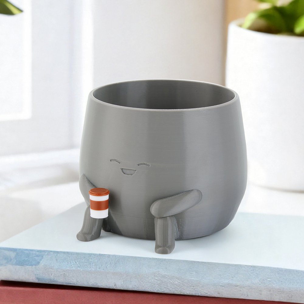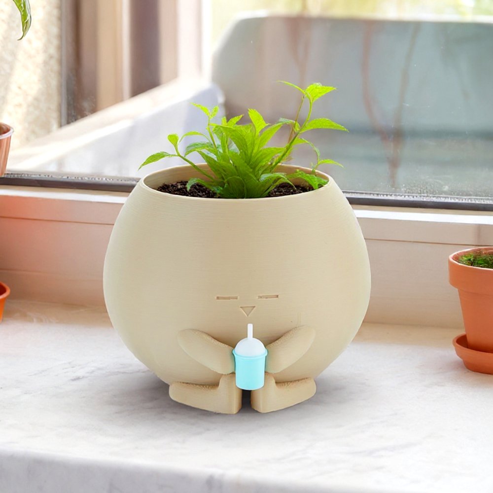 The adorable 3D-printed plant pot features a cheerful figurine holding a drink, available in multiple colours and two distinct styles. You can customize both the type of beverage and add a personal name, creating a truly one-of-a-kind decorative piece that reflects your style.