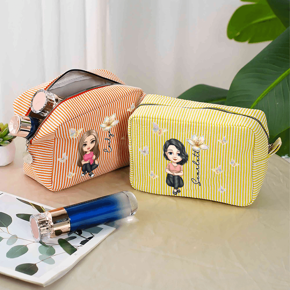 Personalised Multicolour Birth Flower Cartoon Character Striped Makeup Bag with Name Daily Travel Essential Birthday Mother's Day Gift for Women