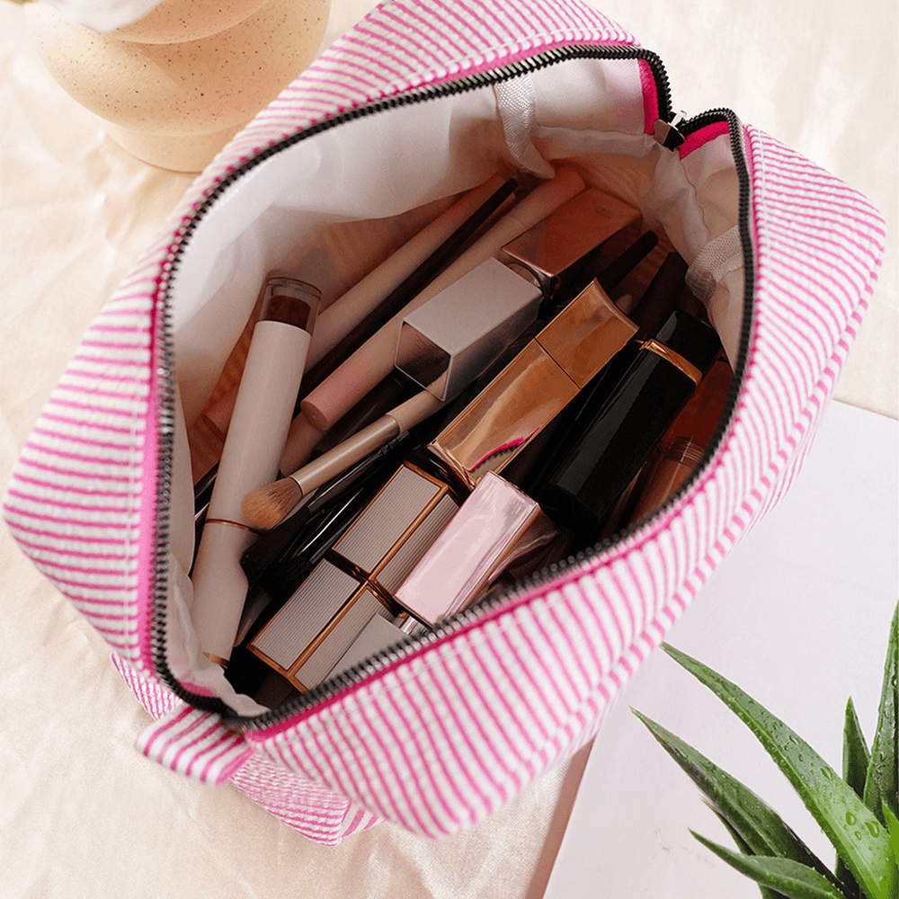 Made of high-quality striped fabric, soft to the touch, skin-friendly, wear-resistant, and not easy to pill; lined with smooth inner lining, smooth access to beauty products without sticking; exquisite sewing craftsmanship, double reinforcement of bag edges, and smooth zipper, durable, not easy to open lines or damage, maintain good usage condition for a long time.