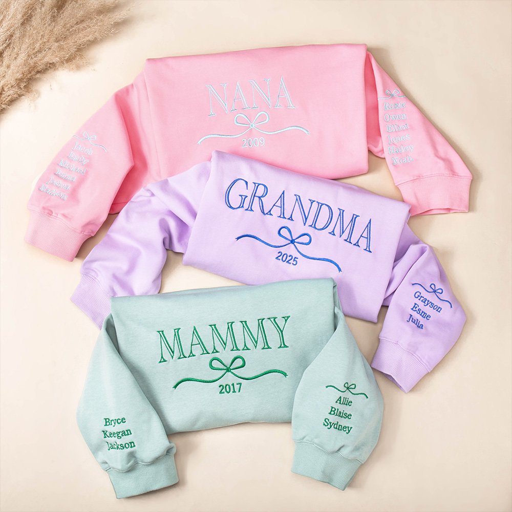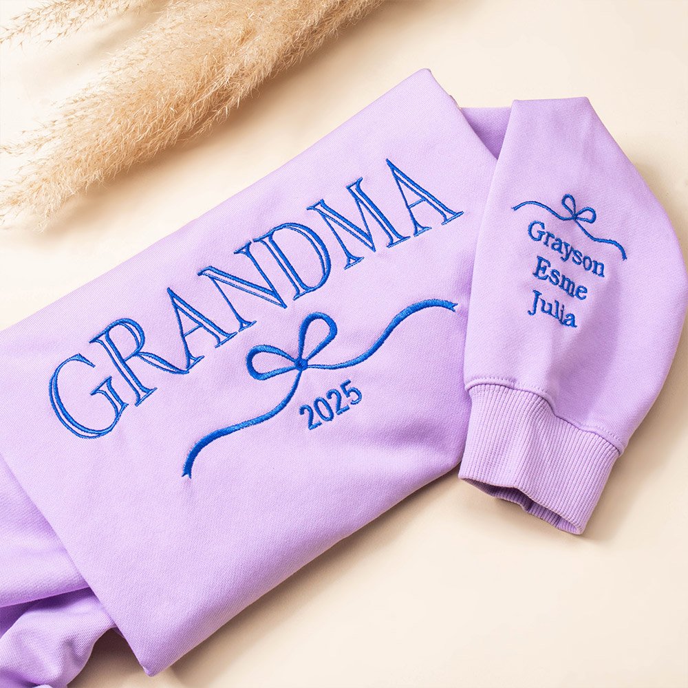 This ultra-soft clothing is a heartfelt tribute to a grandmother's love. It beautifully showcases the names of 1-12 of her grandchildren, elegantly embroidered alongside charming bow accents. Personalised it further with endearing titles like "Gigi" or "Nana" to celebrate her unique identity as a grandmother, transforming an everyday item into a treasured heirloom.