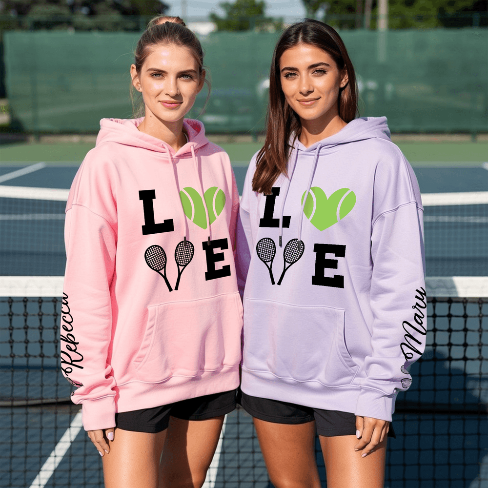 This striking “LOVE” graphic pairs a bright green heart with tennis racket details for a playful, sporty statement. Add custom name printing on both sleeves to create a personalised look that instantly feels like your signature piece.