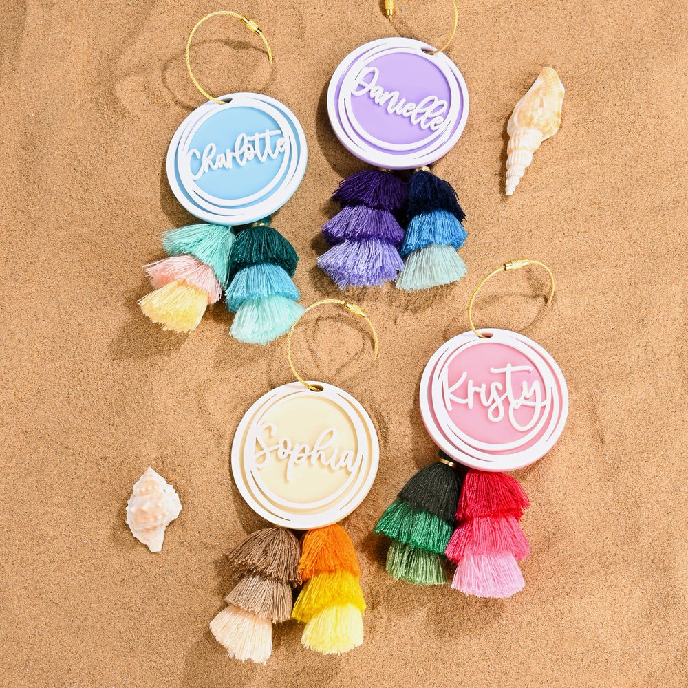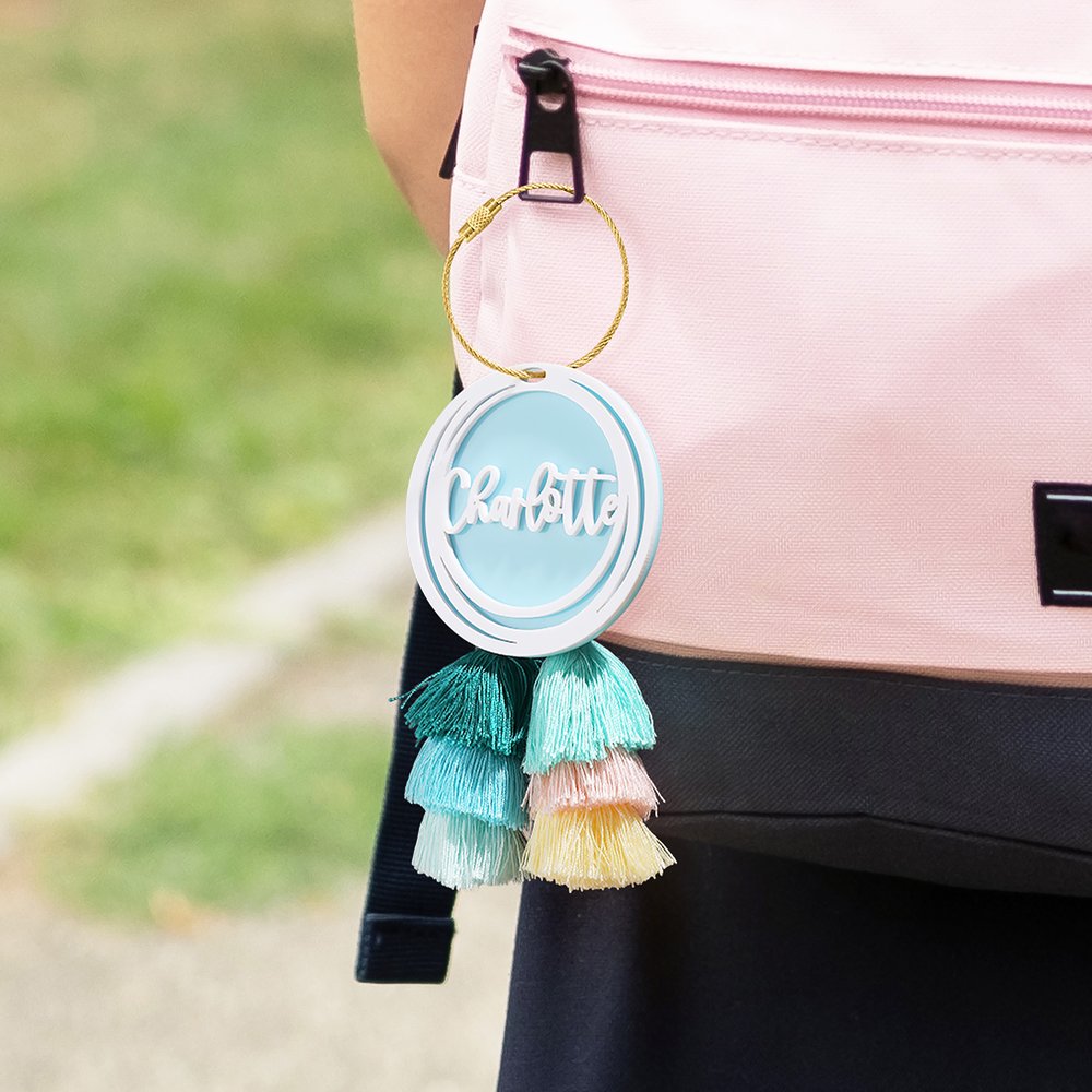 The overlapping circular rings are simple yet stylish, and the customizable name adds a sense of exclusivity to the charm. The gold keyring is practical and easily removable for different bags, adding a touch of sophistication. The double gradient tassels add a dynamic and colourful touch to the charm, making it stand out from the crowd.