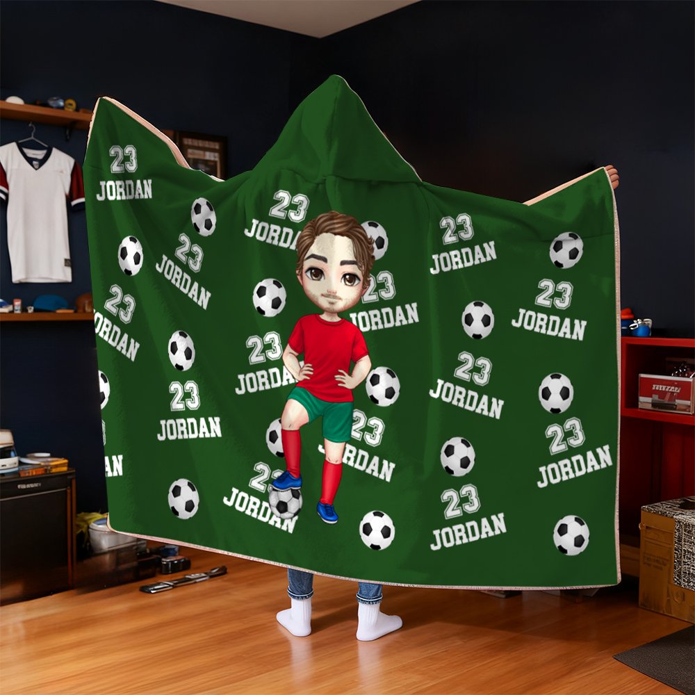 Designed for soccer enthusiasts, this blanket offers 23 colour options. The design incorporates a wealth of soccer-inspired elements, showcasing your endless passion for the sport. What's more, you can customize it with a Personalised cartoon character and your name, making this blanket a one-of-a-kind item.