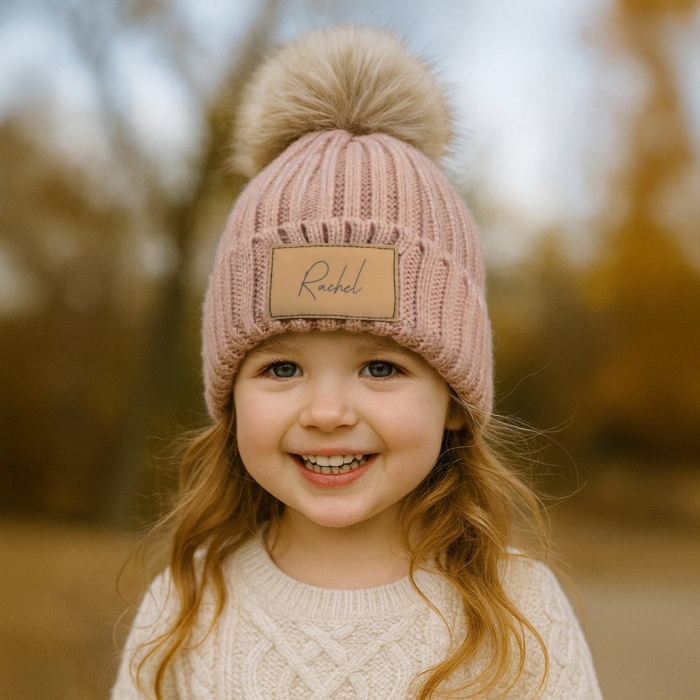 This charming beanie features a vibrant multicolour knit pattern topped with an adorable fluffy pom-pom. Each beanie is personalised with a leather name patch, adding a special touch that makes it uniquely theirs.