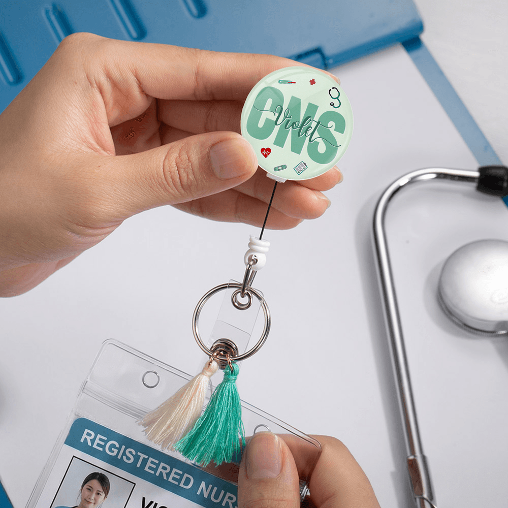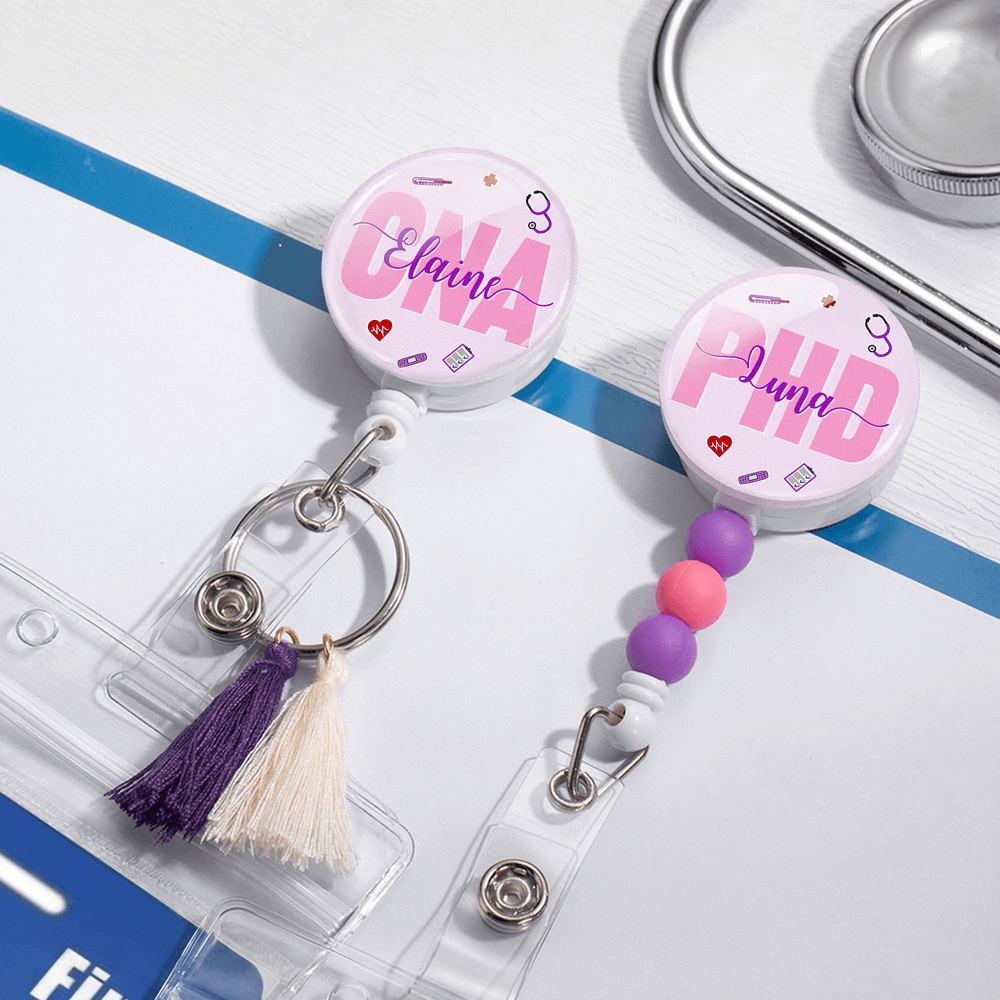 Centreing on the unique combination of your professional title and name, this badge reel vividly presents your healthcare identity. Each piece features a vibrant colour palette—from Teal to Pink—paired with stylish tassels and playful silicone beads that add a refreshing charm. It is more than just a functional tool; it is a personalised statement that highlights your professional role while embodying your unique personality in a clinical setting.