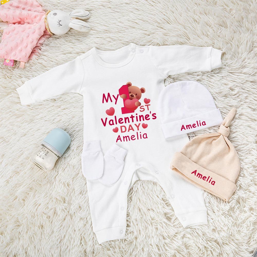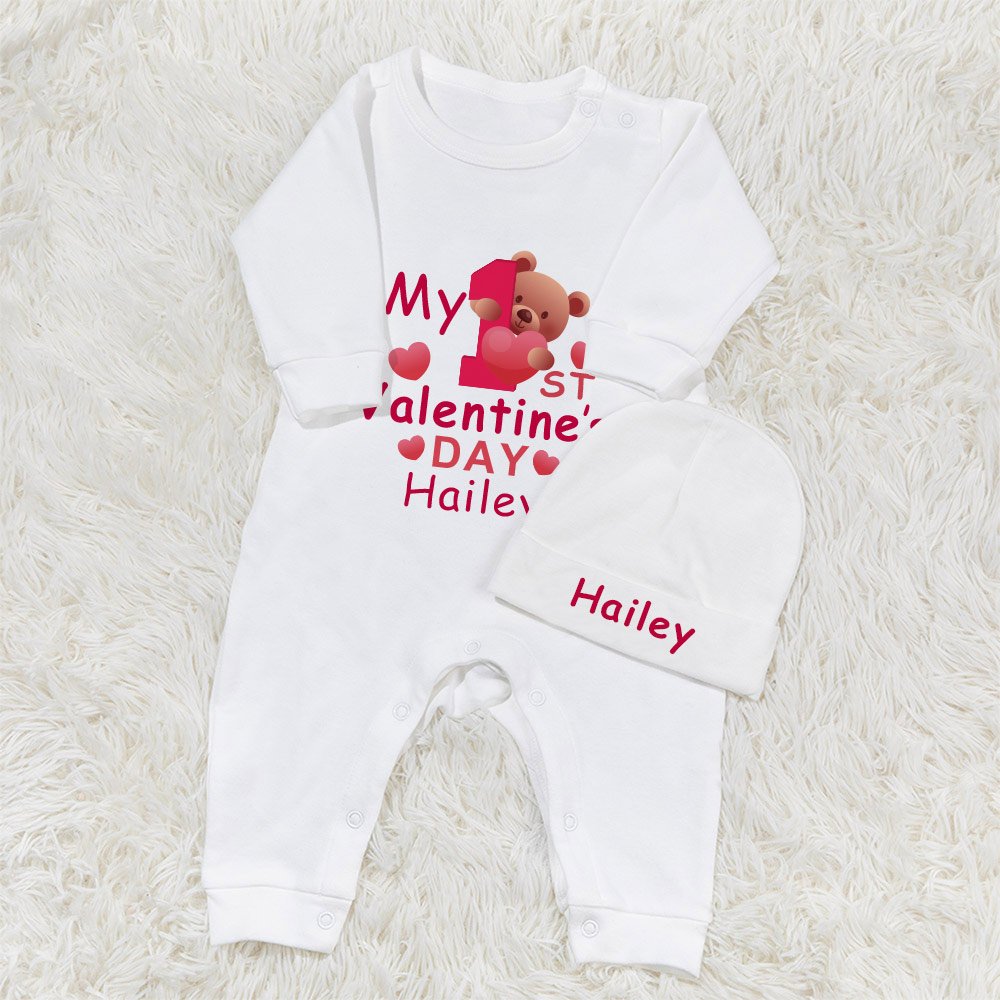 Personalised My 1st Valentine's Day Cotton Long Sleeve Baby Bodysuit with Love Bear and Name Valentine's Day Gift for Baby Infant