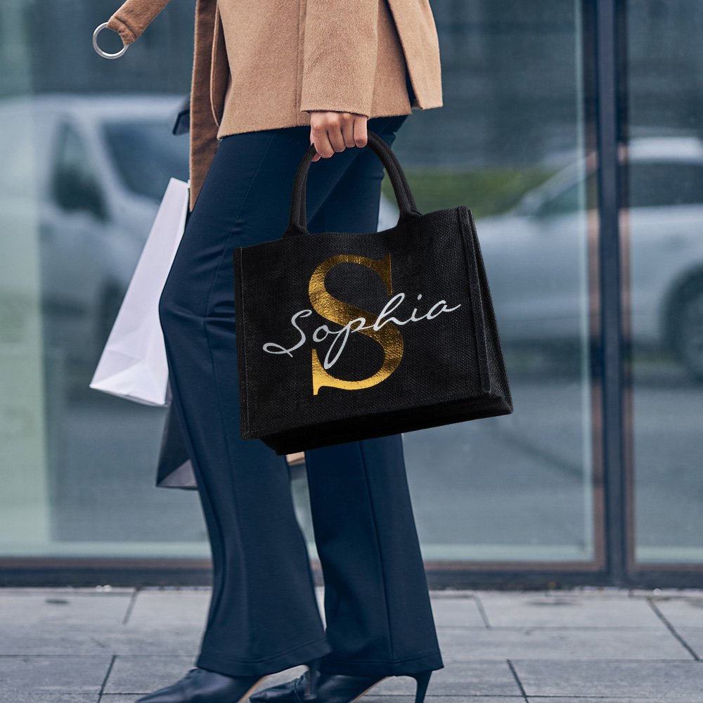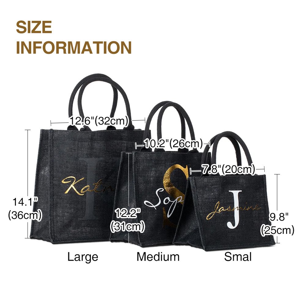 The stylish and chic design of this tote bag features a Personalised name with initial, making it a perfect gift for bridesmaids, wedding parties, bachelorette parties, and travel enthusiasts. The sleek black colour and elegant font add a touch of sophistication to any outfit.