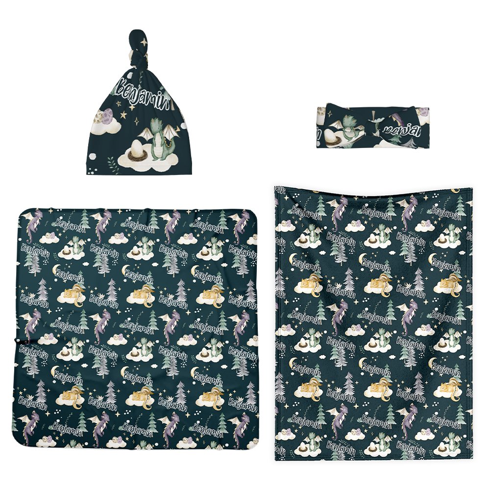 The baby set features an enchanting night sky theme with cute little dragons. These dragons are depicted in a charming and friendly manner, making them perfect for a newborn. The dragons are surrounded by elements like stars, clouds, and trees, creating a magical and whimsical scene that will capture the imagination of both parents and the baby.