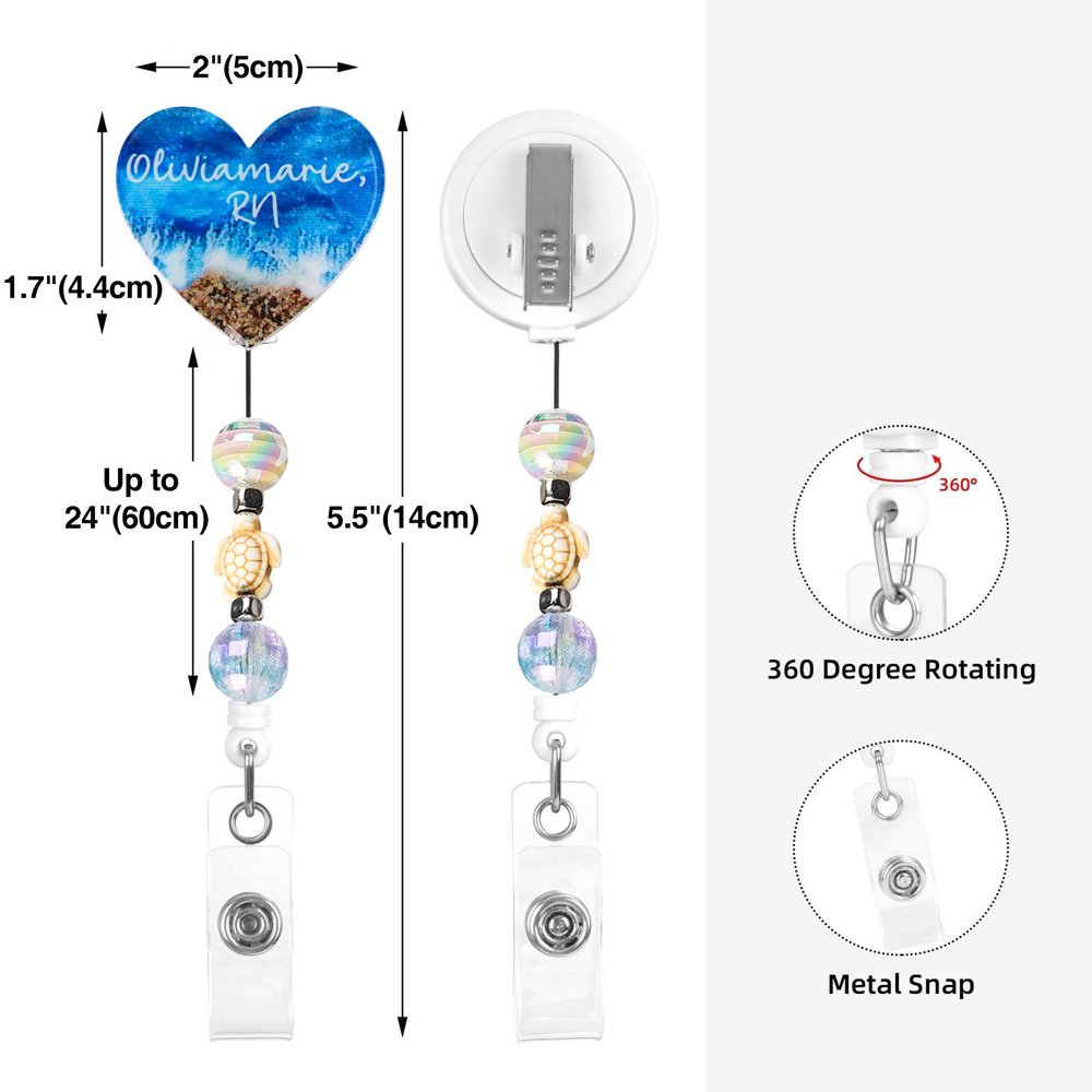 The badge reel features a specially designed ocean and beachside pattern, adorned with two beautiful beads and a stone turtle, cute and energetic, making it a fashionable accessory that stands out from the crowd.