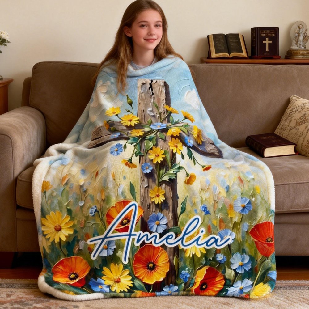 This blanket features a Christian cross as its central design element, complemented by colourful flowers. Its classic oil painting style creates a soft and elegant visual effect, exuding a warm and inviting feel. Customization with a personal name is available, perfectly blending individual identity with religious elements. Combining aesthetic appeal with a sense of faith, it precisely meets the spiritual needs and aesthetic preferences of Christians.