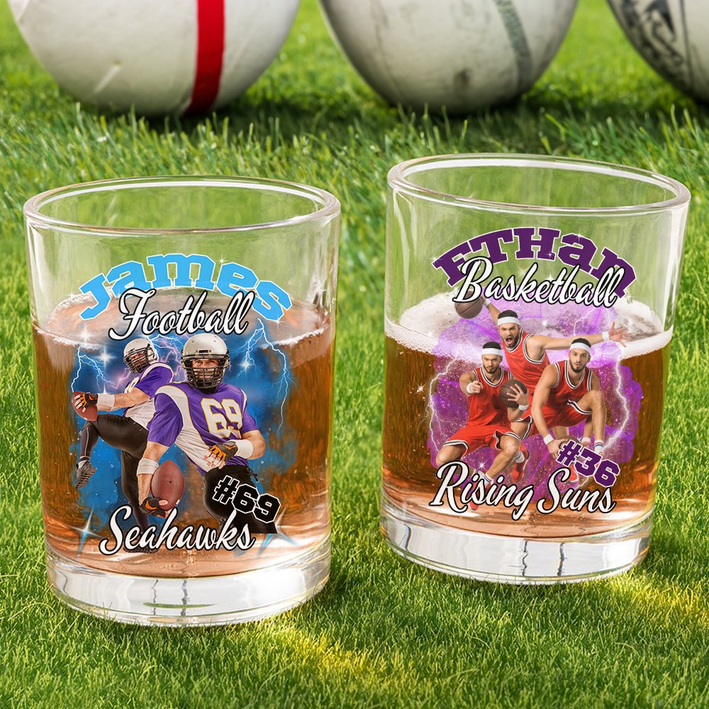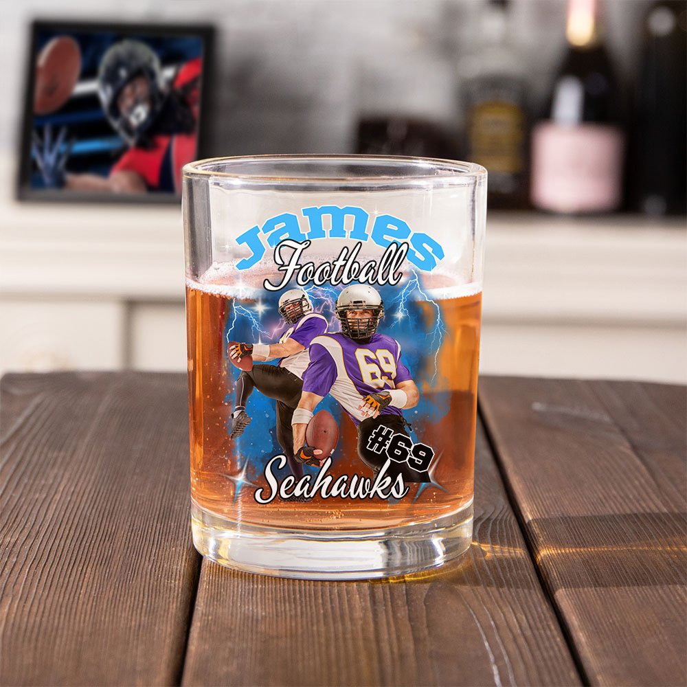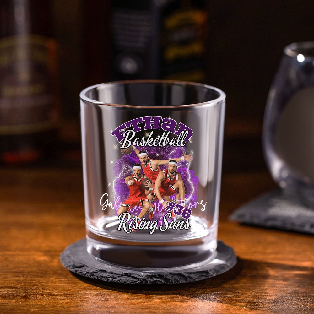 This old-fashioned rock-style whisky glass has a unique and eye-catching design. You can Personalise it with your name, team name, and photo and upload up to 5 photos with a flame design as the background. The name, number, and text on the glass can be customized to make the glass more personal.