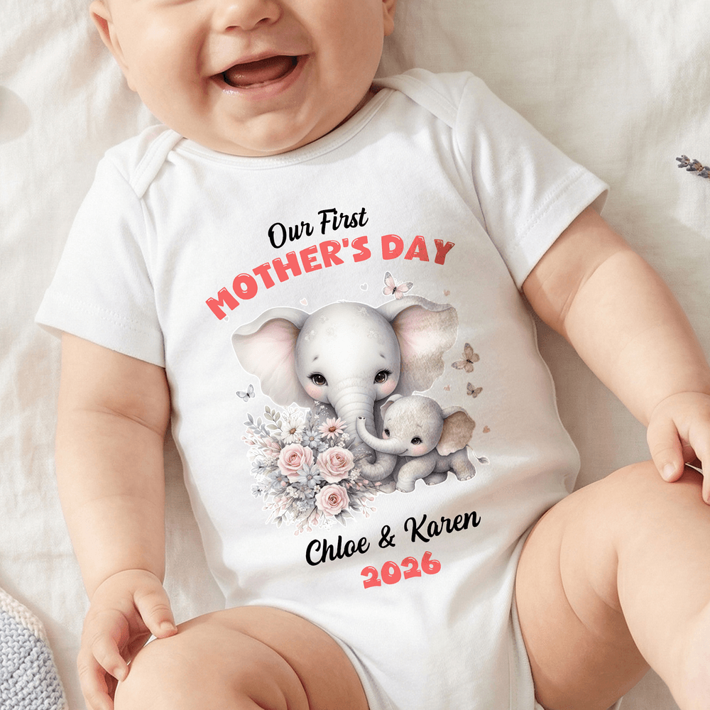 This set features a cute elephant as its central design element, accompanied by the title "Our First MOTHER’S DAY," creating a playful and childlike overall look. It also supports name customization, allowing you to create a personalised parent-child set.