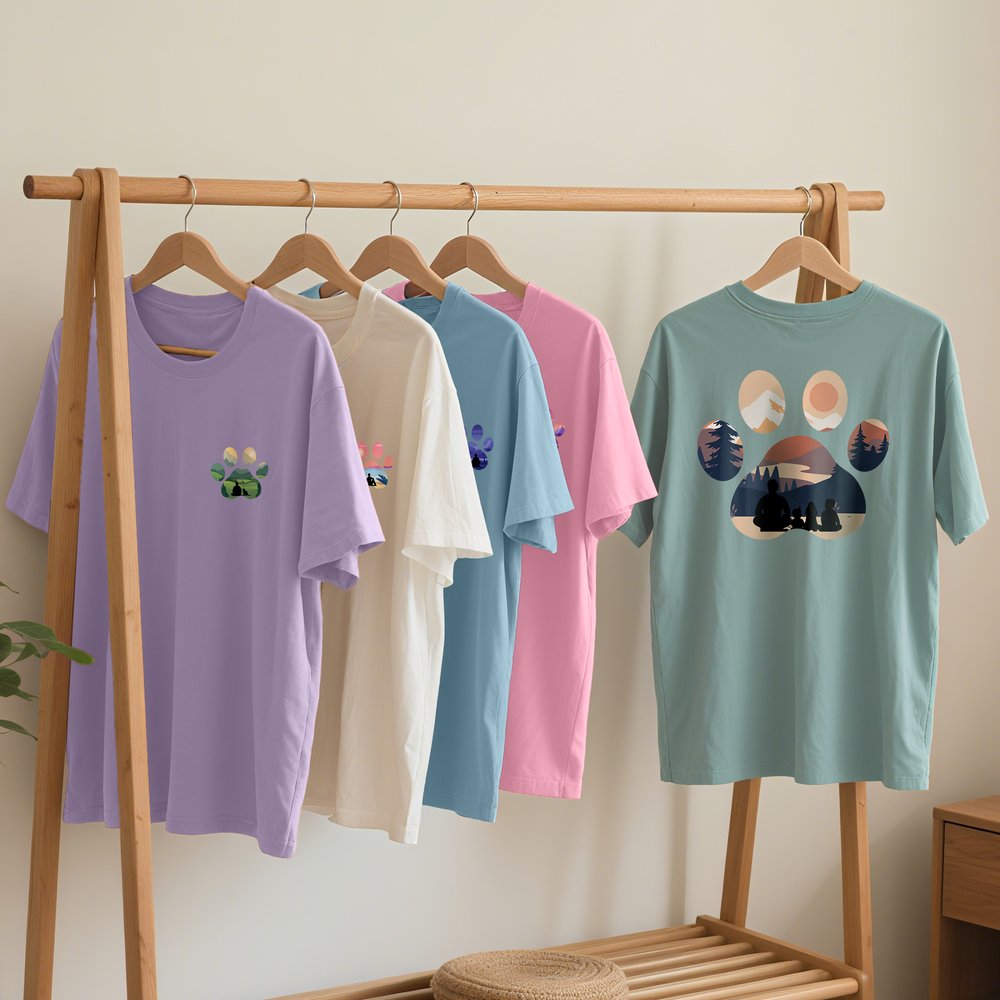 The apparel features elements of hiking, outdoors, nature, dog paws, and character silhouettes. You can choose the back dog paw pattern background (with various styles like moonlit night and sunrise), select 1-6 family members’ silhouettes, and condense the warmth of pet companionship and the healing power of outdoor nature into exclusive wearing symbols.