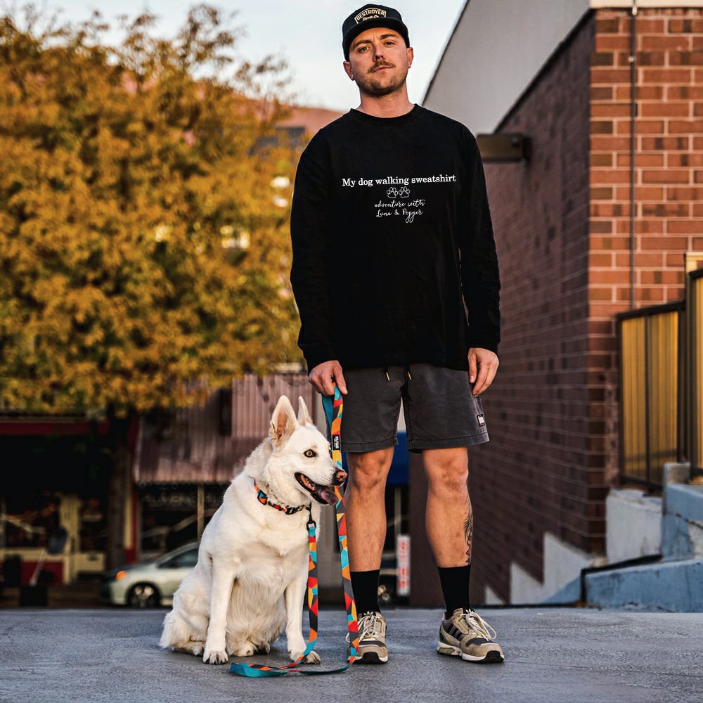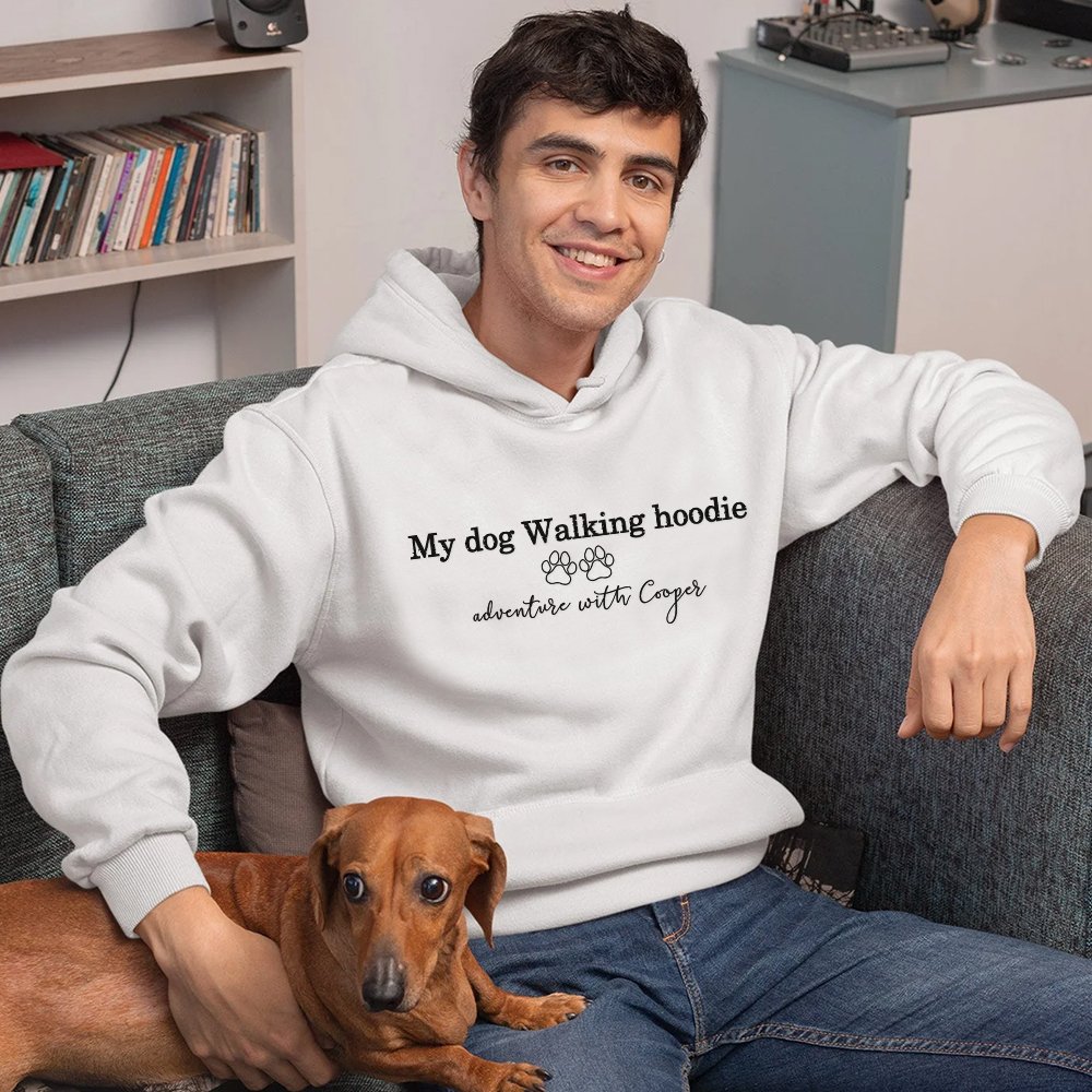 This stylish hoodie/sweatshirt is emblazoned with the phrase "My Dog Walking Hoodie/Sweatshirt." It's ideal for all your dog-walking excursions. It's not just a piece of clothing; it's a statement of your dedication to your canine companion and the joyful routine of daily walks.