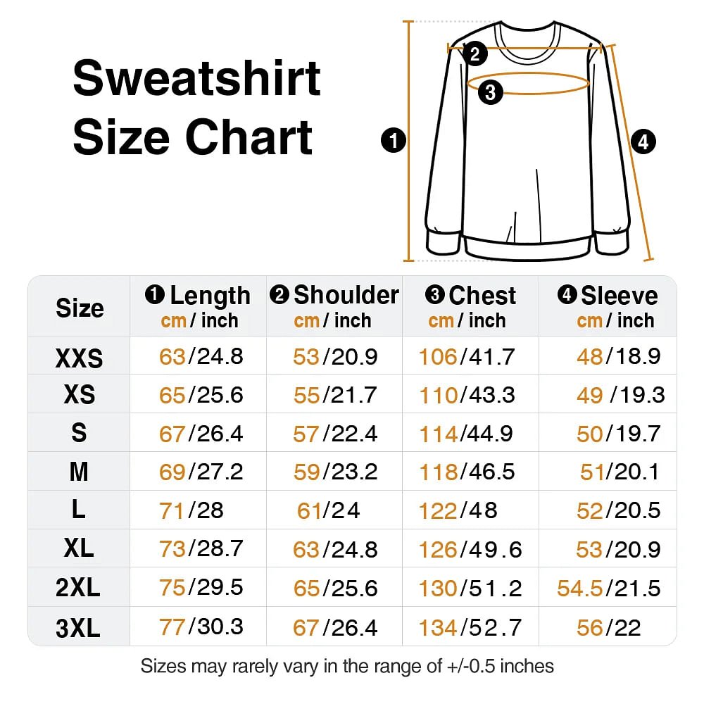 | Measurement: | Sweatshirt - XXS, XS, S, M, L, XL, 2XL, 3XL Hoodie - XXS, XS, S, M, L, XL, 2XL, 3XL |