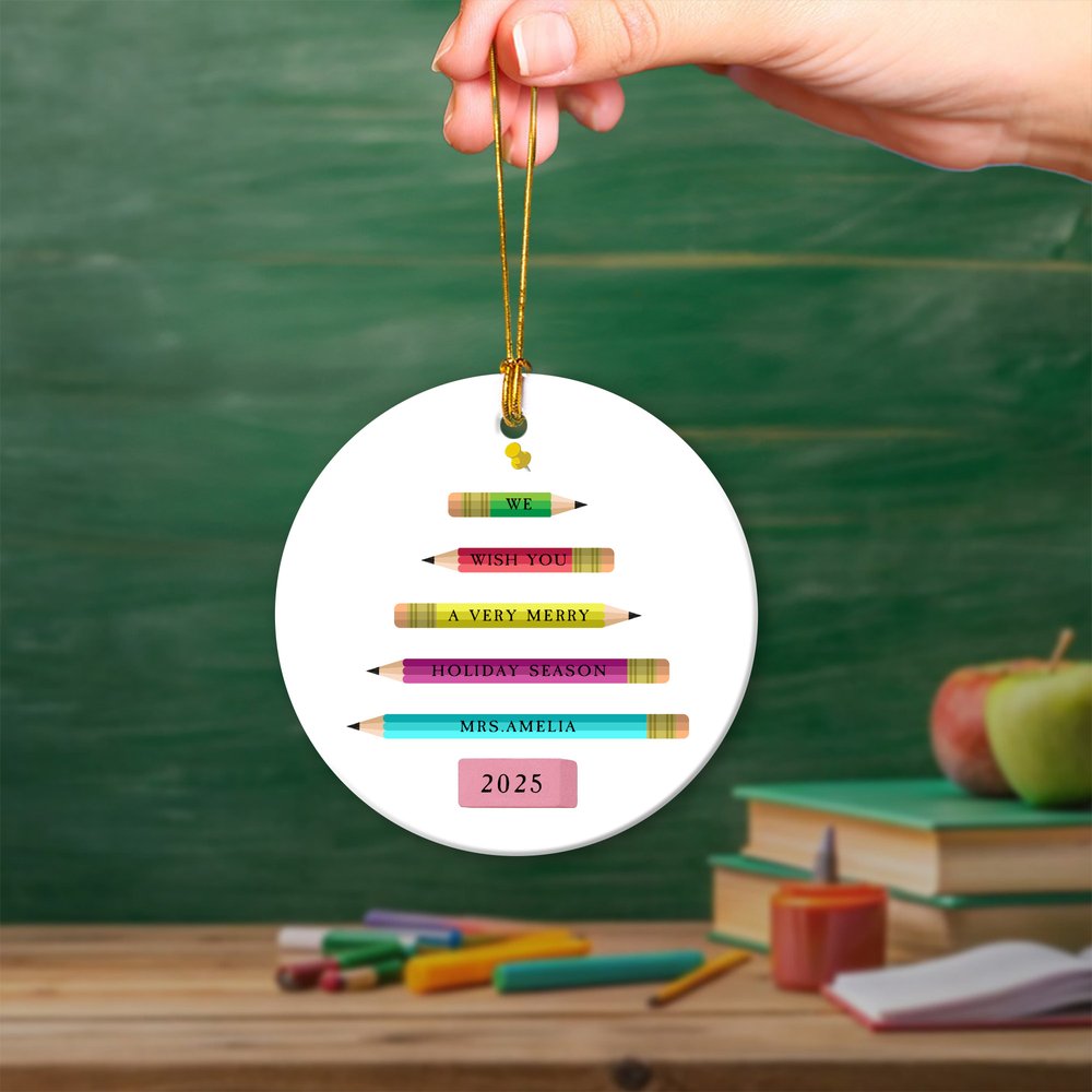 This ornament cleverly combines elements of a pencil and a Christmas tree, reflecting the unique professional qualities of a teacher while embodying the festive atmosphere. The pencil is also printed with a warm message, "WE WISH YOU A VERY MERRY HOLIDAY SEASON," along with the teacher's name and the year, adding a personal touch.