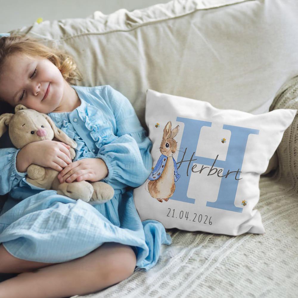 This cushion cover, inspired by the classic Peter Rabbit image, will be deeply loved by the kids! You can customize the pillow cover with an initial, date, and your child's name. There are 8 pillow cover colours to choose from and 3 rabbit styles to choose from, which makes each cushion cover a unique and exclusive item that accompanies a child through every sweet dream.