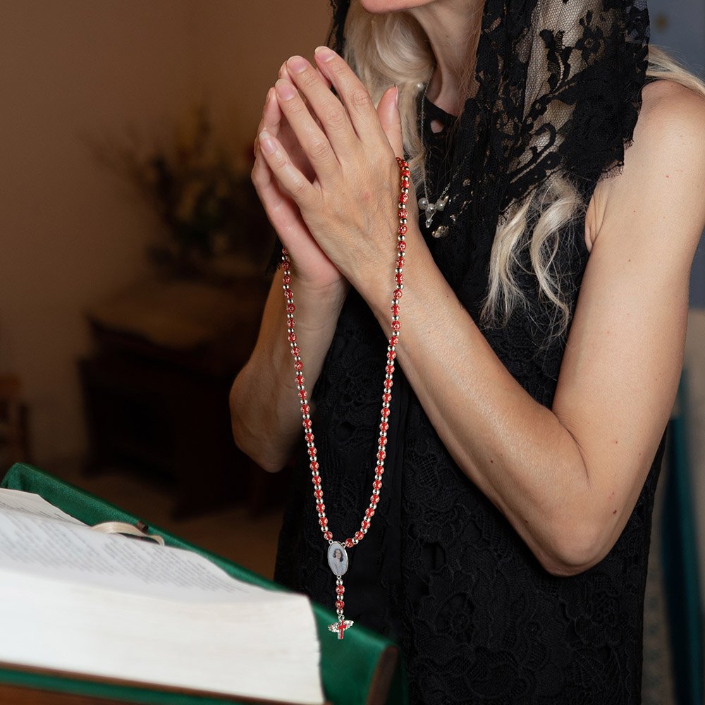 This necklace skillfully blends religious beliefs with personal feelings. The core of its design is the exquisite cross pendant, not only a symbol of devout faith but also a blessing for loved ones. These beads are made of three classic colours, blue, white, and red, each with a different meaning and emotion. In addition, the pendant can be embedded with precious photos, which is of great commemorative value.