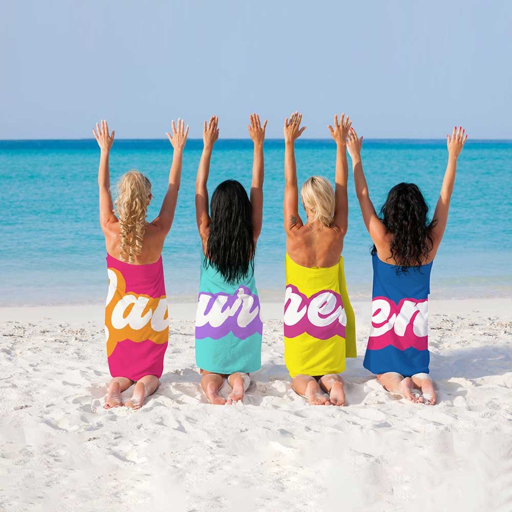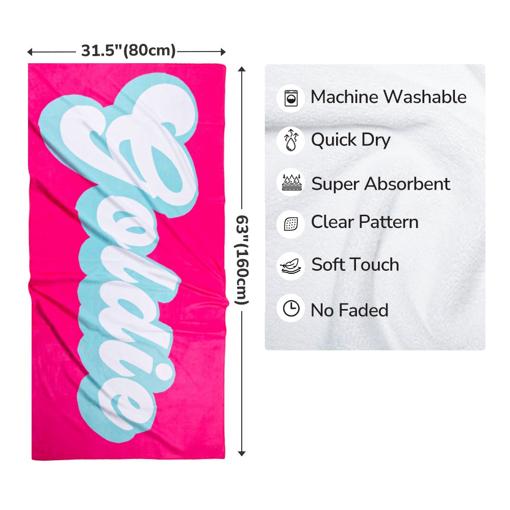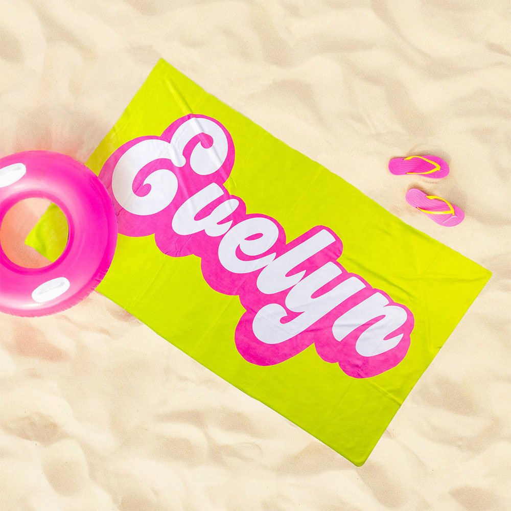 The Personalised name on the towel is beautifully showcased with the retro font option and bright colours. Stand out from the crowd with a towel that not only represents your unique identity but also catches everyone's attention. It's a true statement piece!