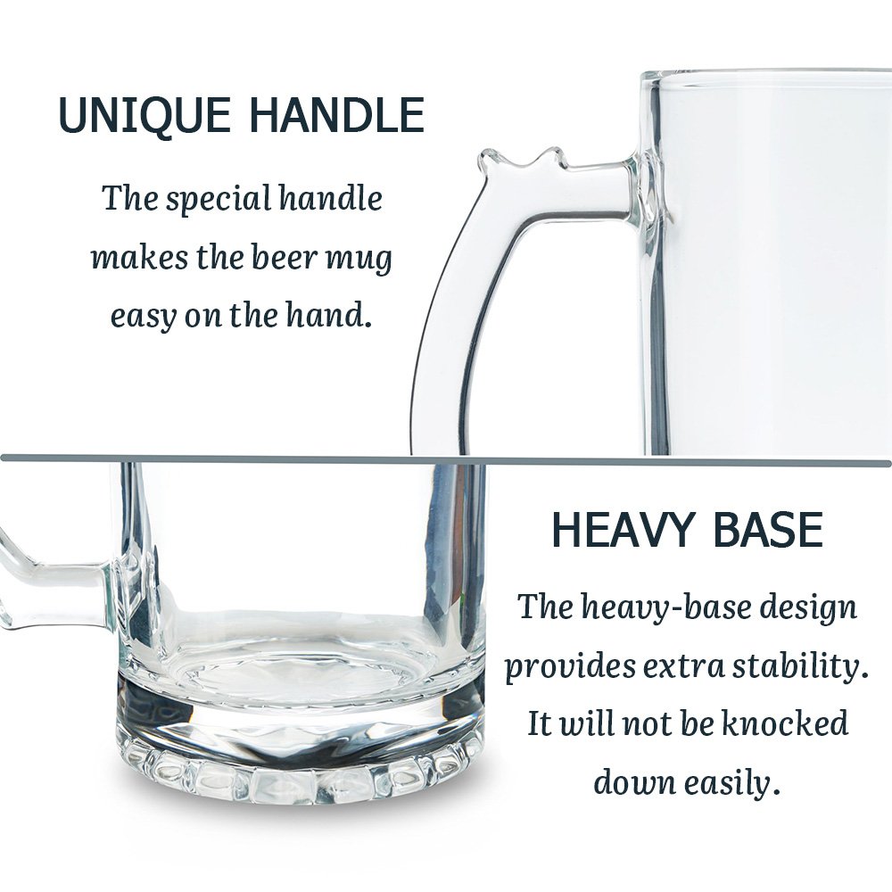 This beer glass is suitable for drinking beer, and its elegant design makes it ideal for drinking other drinks, such as wine, juice, or soft drinks. The handle design makes the glass easy to carry; whether it is an outdoor picnic, a family gathering, or a gathering of friends, it can become a focus of attention.