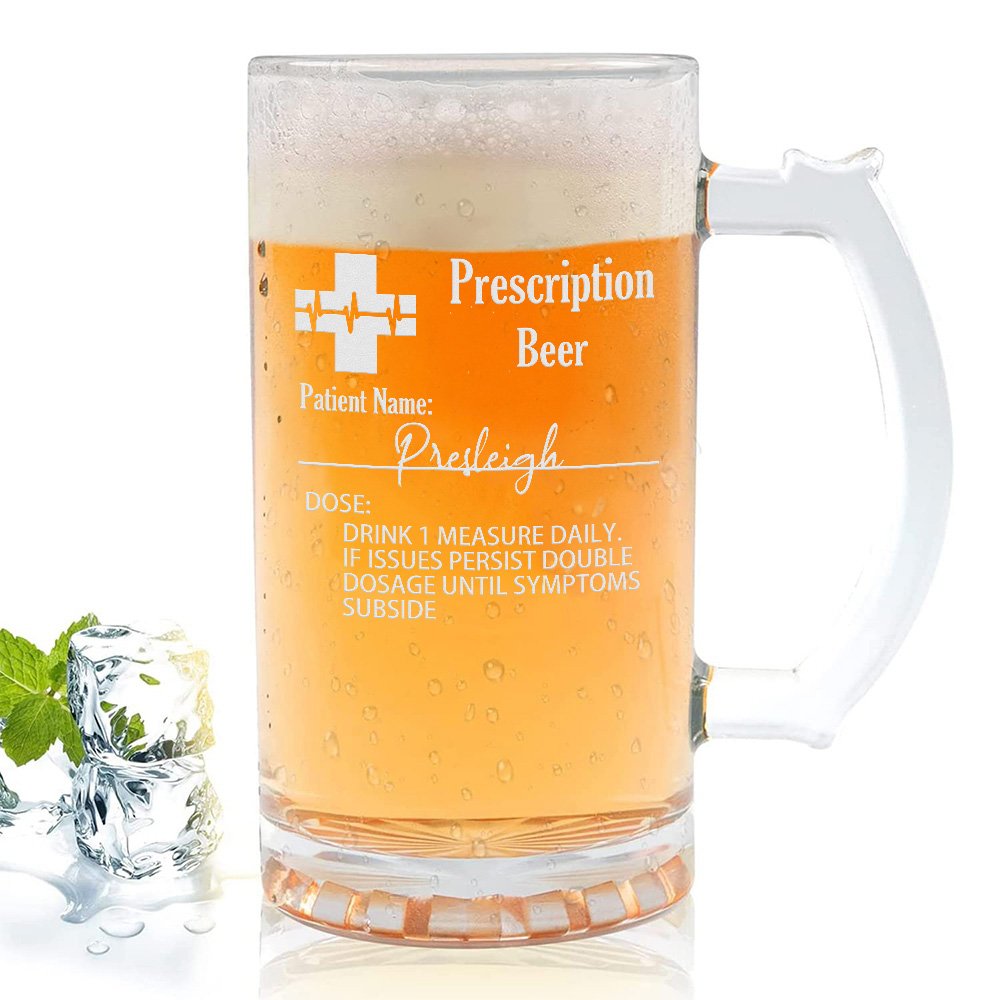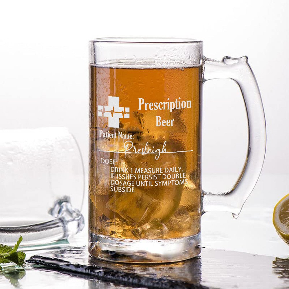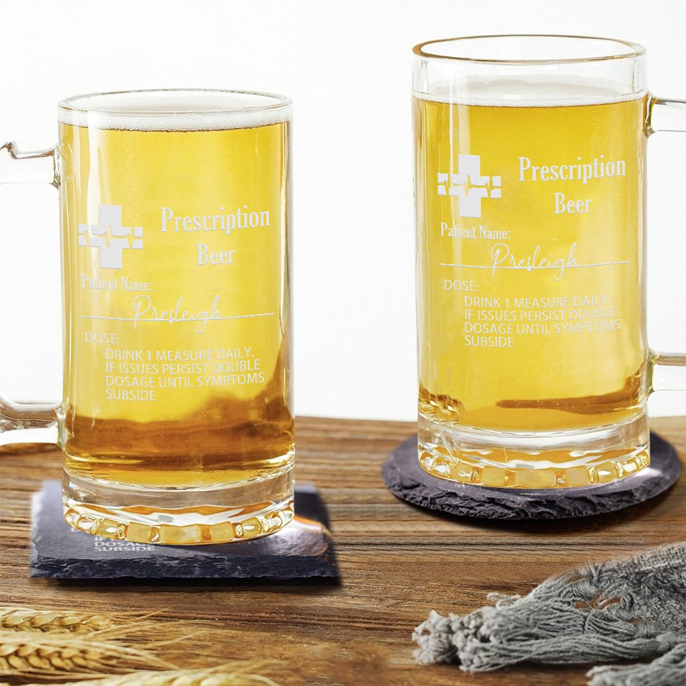 Personalised Funny Prescription Engraved Name 16oz Glass Whisky Beer Mug with Handle Slate Coaster Set Birthday Gift for Dad Grandpa Liquor Lover