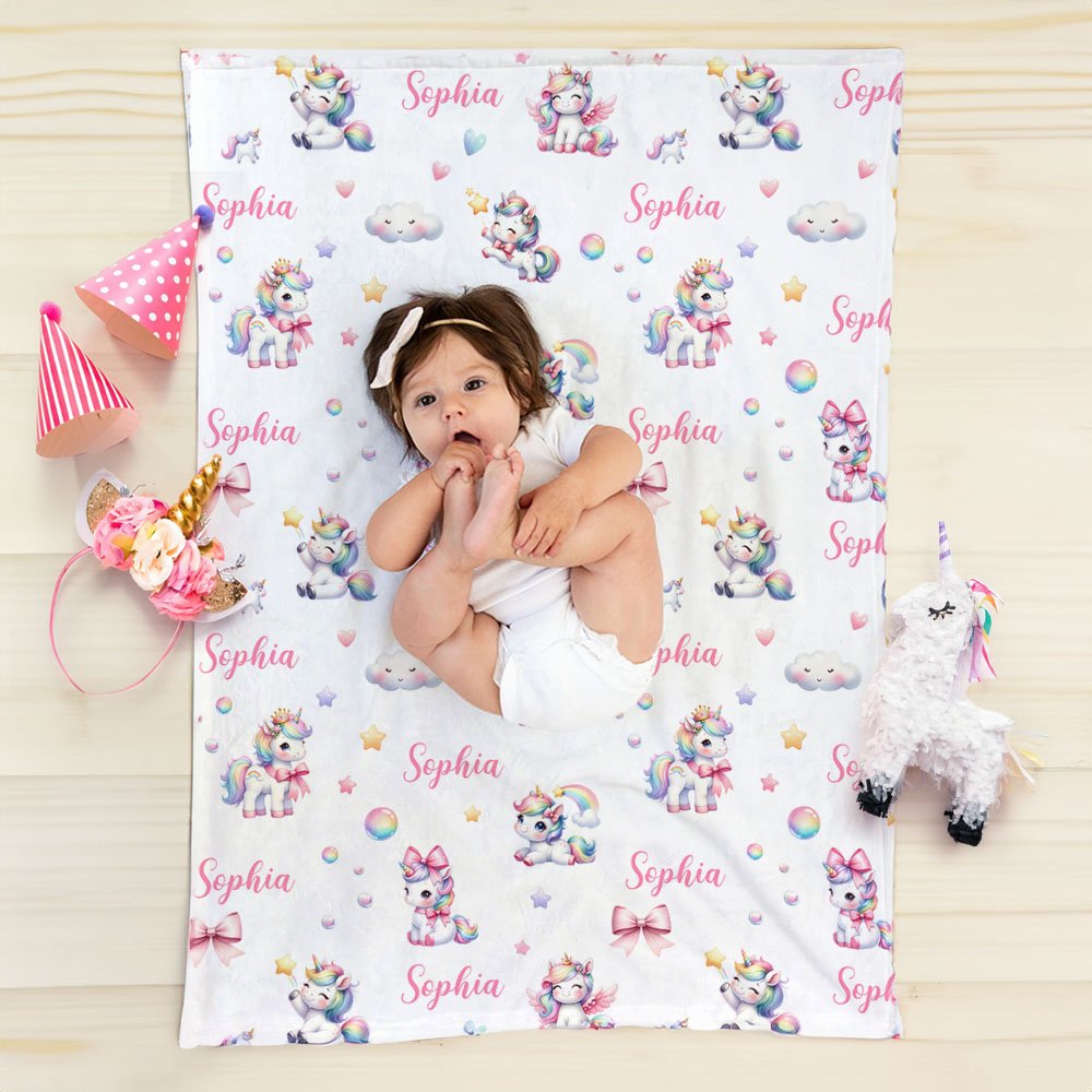 Personalised Rainbow Fantasy Unicorn Unisex Baby Receiving Blanket Swaddle Hat Bow Headband Coming Home Outfit with Name Baby Shower Gift for Newborns