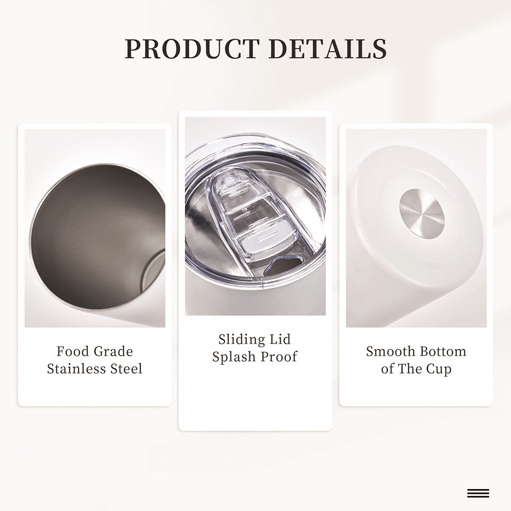 The product cup body is made of food-grade stainless steel, and the lid is BPA-free and safe for drinking. Whether you're on the go or just relaxing at home, the innovative design of the lid's leak-proof slider prevents unwanted spills. Double-wall insulation ensures your drinks stay hot or cold, making it ideal for refreshing ice drinks and cozy hot drinks.