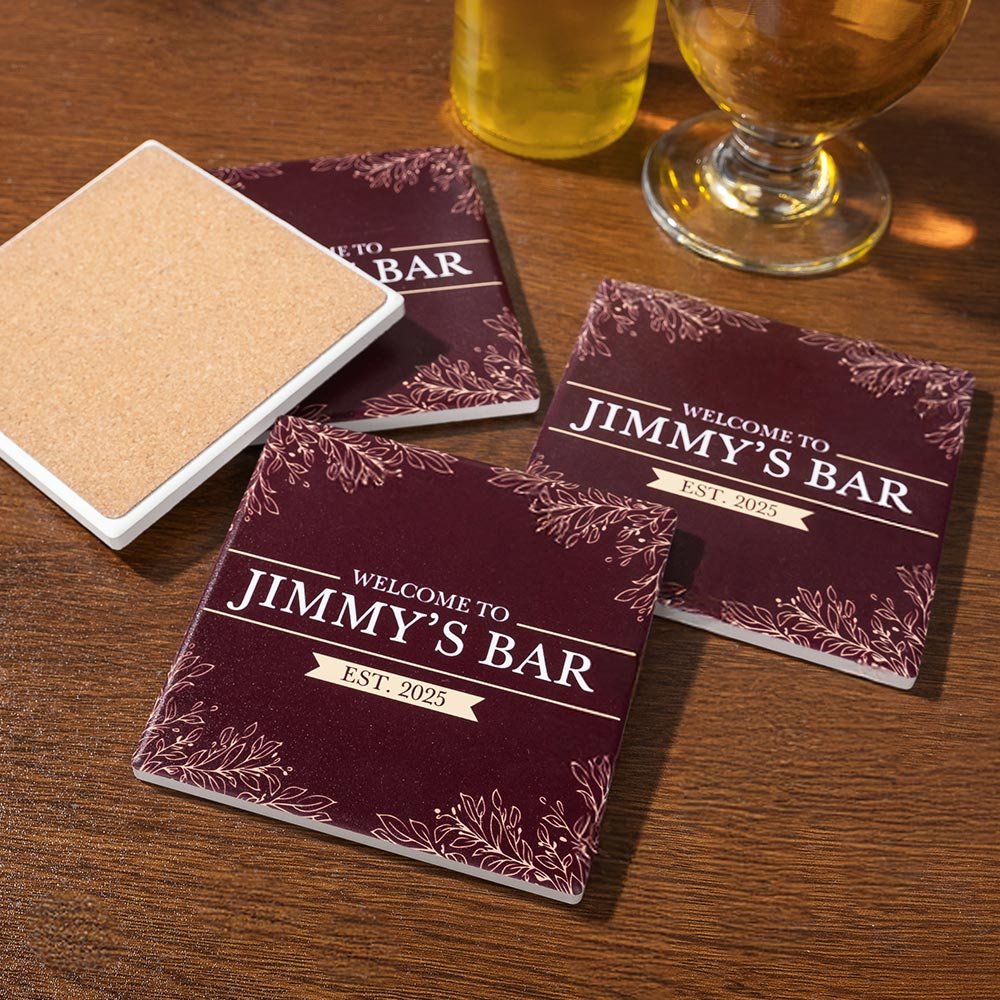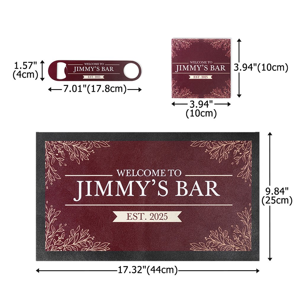 This complete set of bar mats, coasters, and bottle openers features a beautiful and simple leaves pattern, combining practicality and style. Available in 5 retro colour options, you can purchase the set to suit your decor style and customize it with your name and year to create a Personalised home or bar decoration.