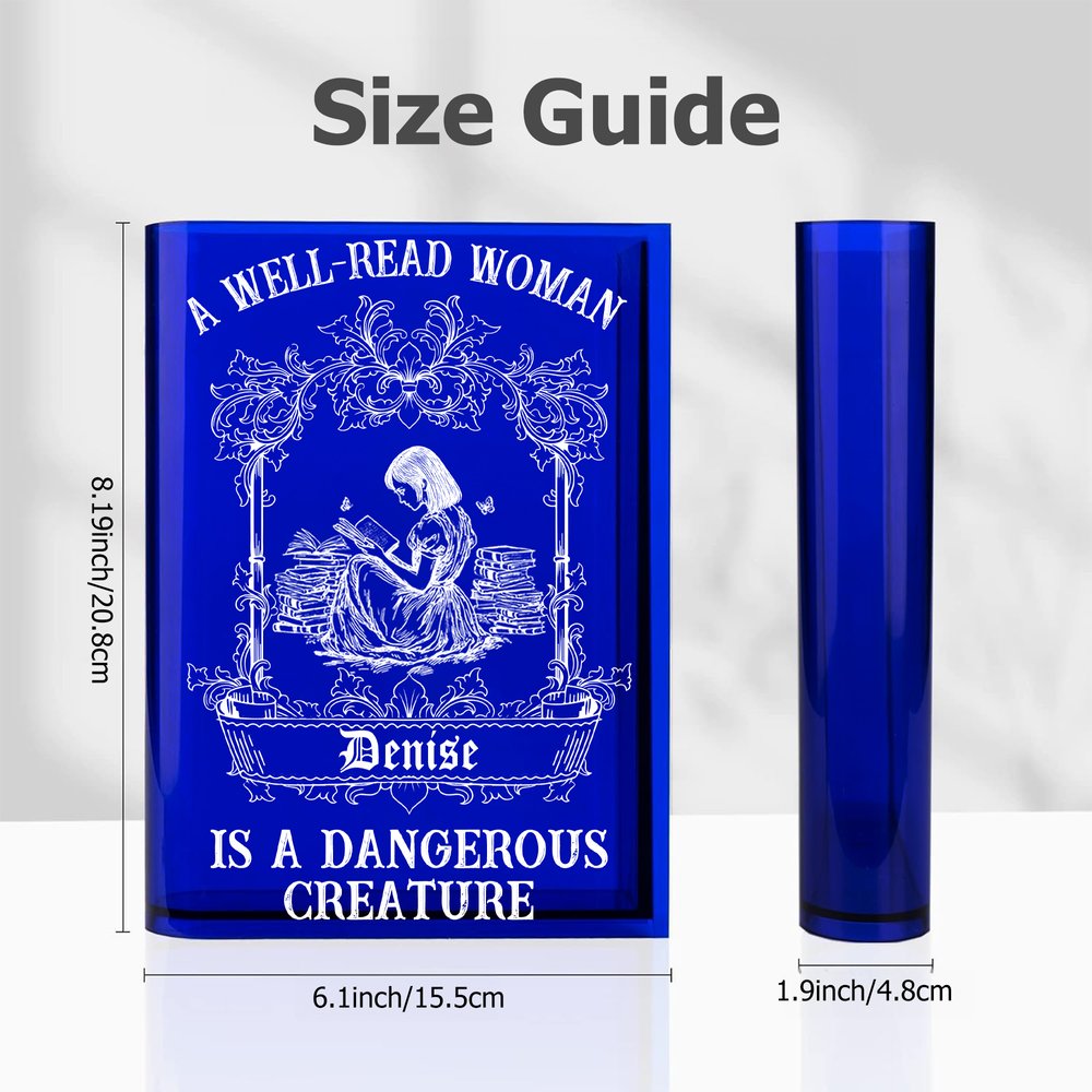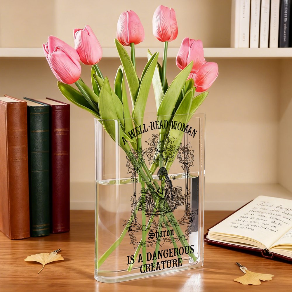 This unique vase features a retro book-like design with an intricate illustration of a woman engrossed in reading, paired with the humorous slogan “A Well-Read Woman Is a Dangerous Creature”. You can customize it with a name and even choose a specific hairstyle for the reading girl, making it a truly one-of-a-kind piece that celebrates literary charm.