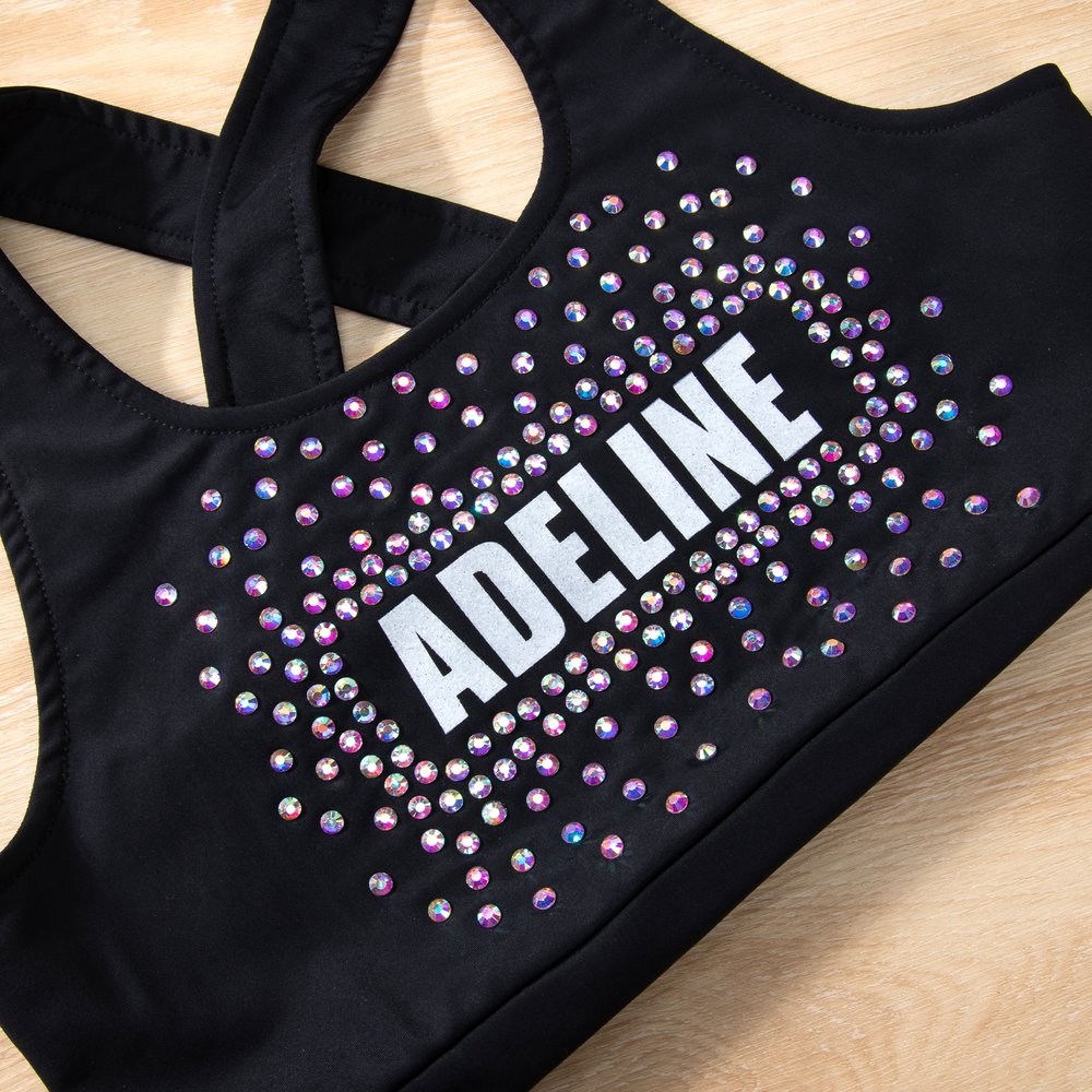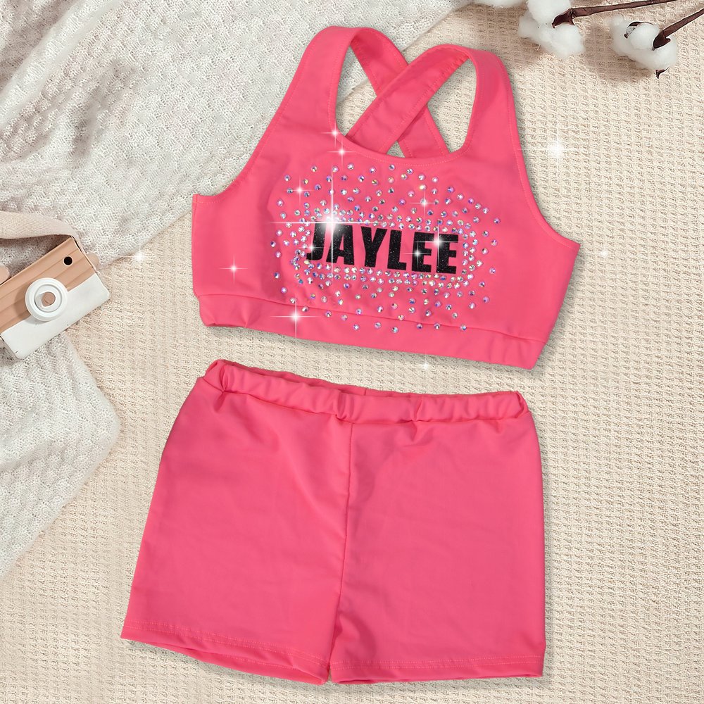 The fine particles on the letters shimmer softly, and the surrounding rhinestones are like starlight, reflecting a vibrant glow in the sun. You can choose black or hot pink, with sizes from XS to XL. You can also customize a name to create a “highlight uniform” unique to cheerleading girls.