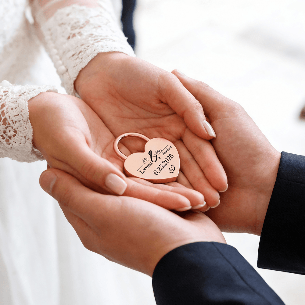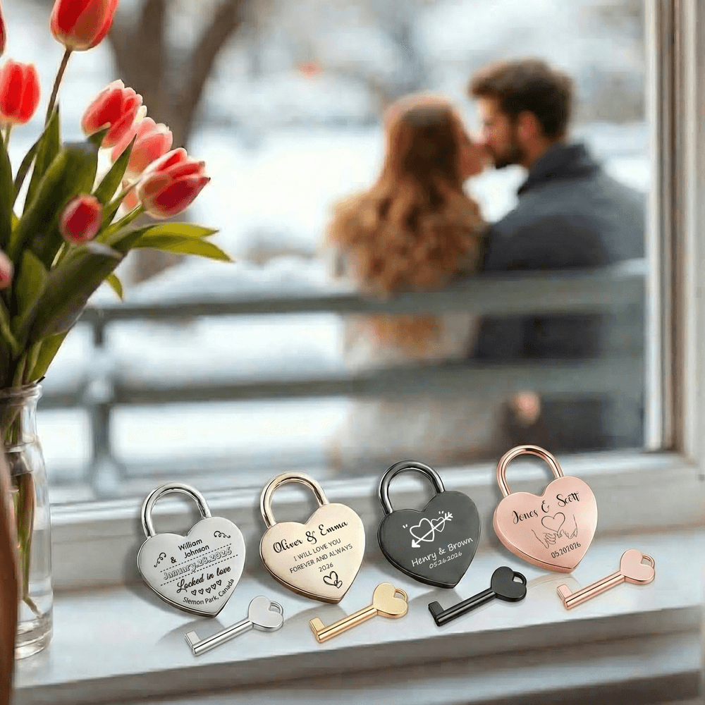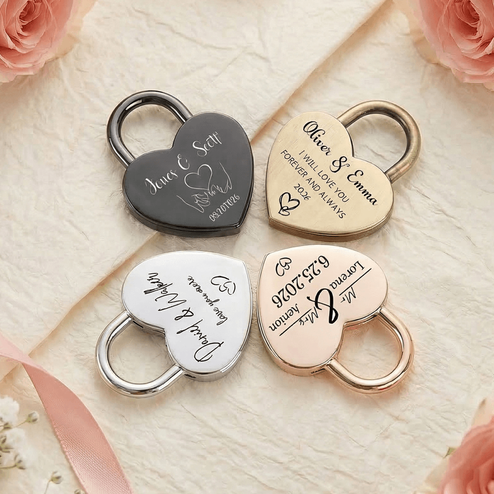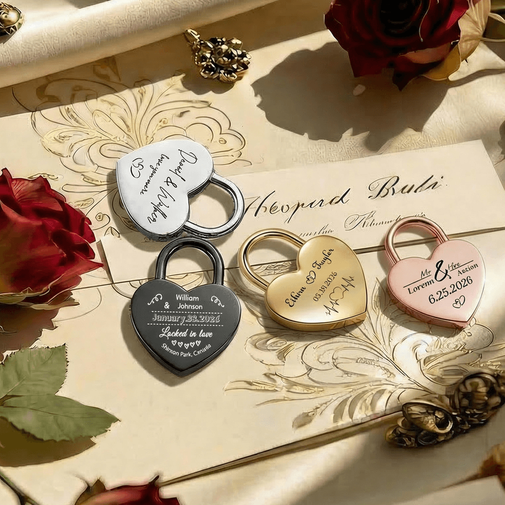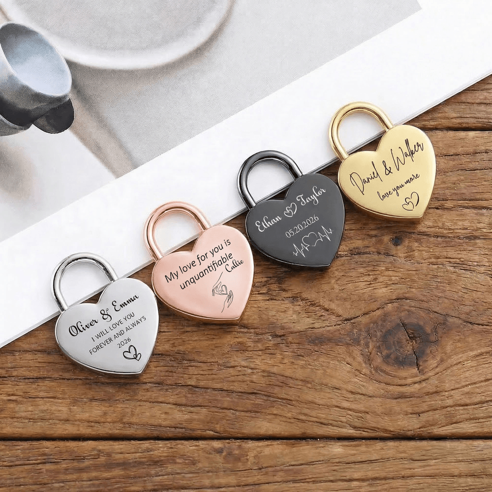 This iconic heart-shaped love lock is the ultimate symbol of eternal commitment, available in 4 premium finishes: gold, rose gold, silver, and black. Fully customizable, it lets you name, initials, special dates, heartfelt phrases, or romantic motifs like hearts, heartbeat lines, or puzzle pieces, turning a simple lock into a one-of-a-kind keepsake that captures your unique love story.