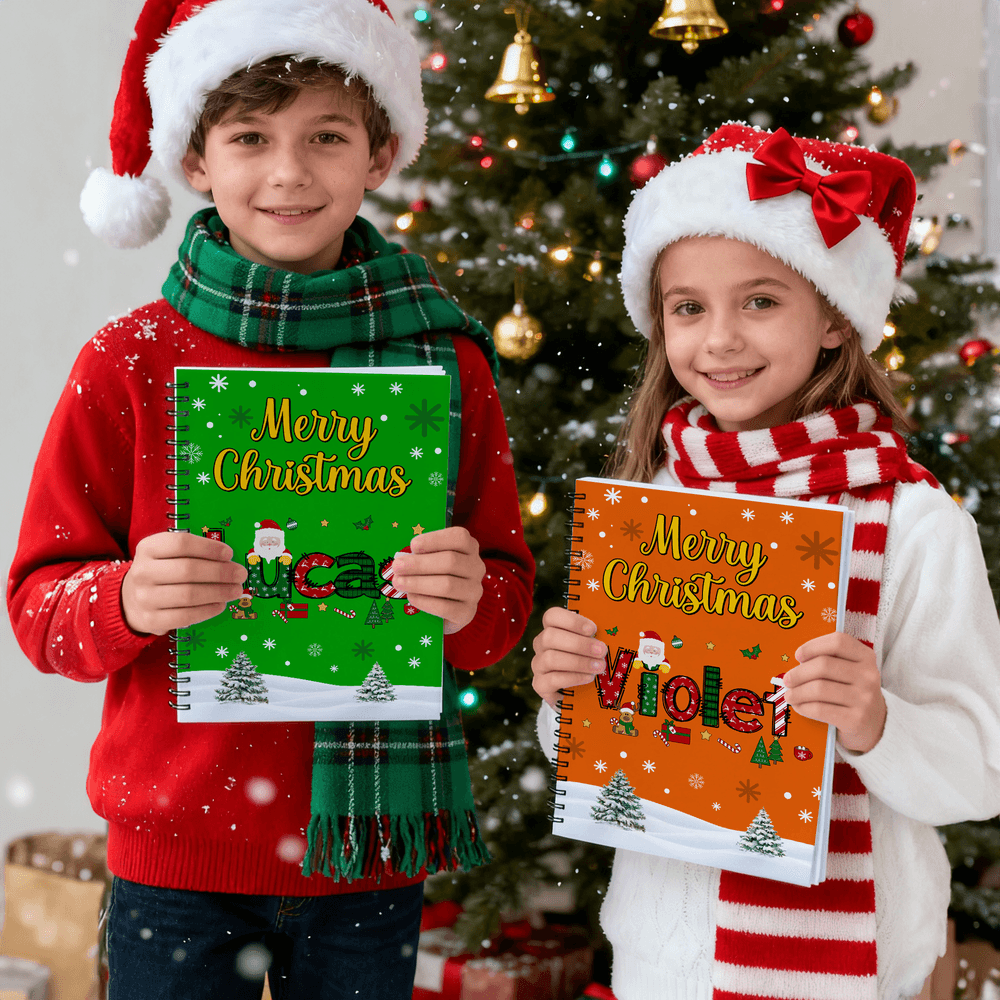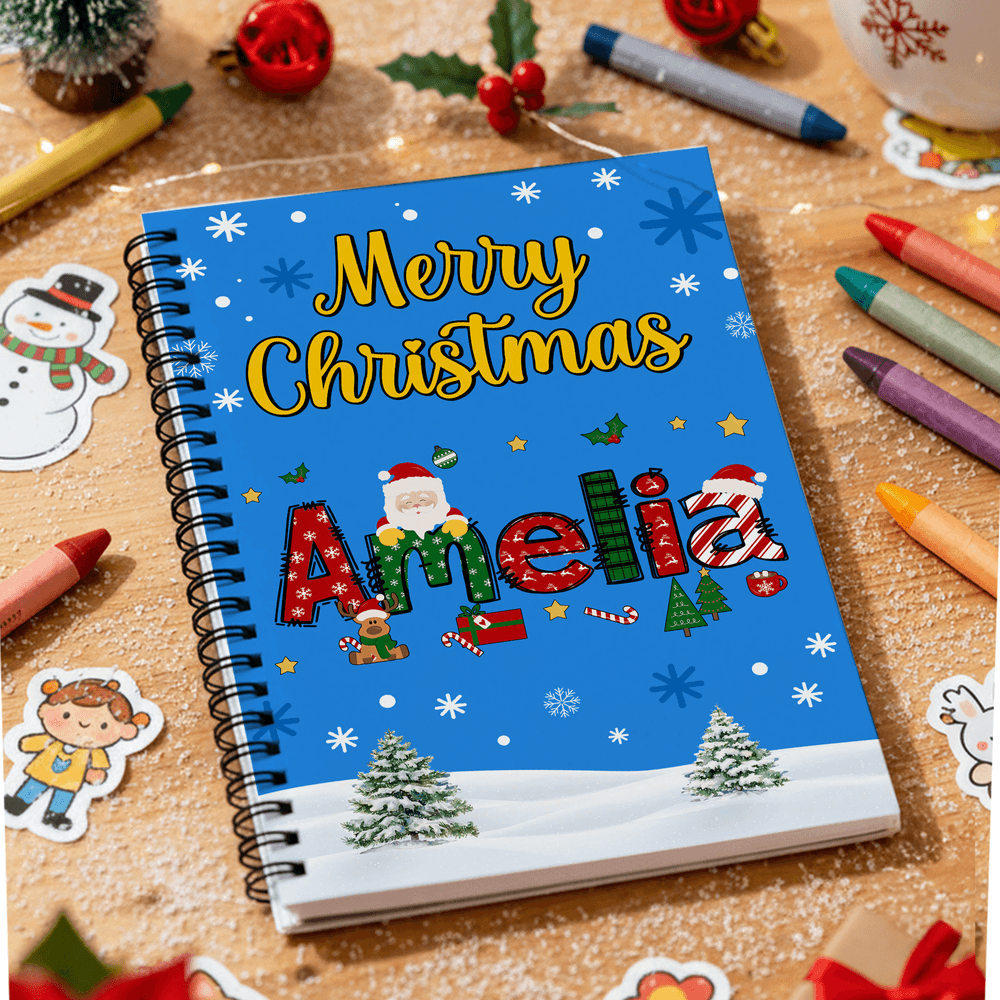 This Christmas notebook features a vibrant Christmas alphabet design, with a cover that can be customized with the child's name, cleverly blending holiday elements with personal touches. Each letter uses lively, festive colours and adorable shapes, transforming the notebook into a personalised Christmas drawing board and inspiring children's enthusiasm for writing and creation.