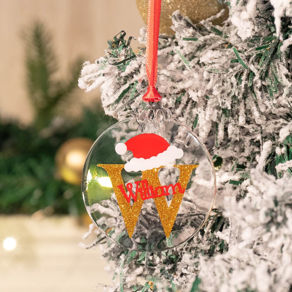 The design of this Christmas bauble is simple and elegant. The whole bauble adopts the shape of lamp and a golden letter is skillfully embellished on it, both highlighting the festivity of the festival, but also revealing a low-key luxury. The design of the Santa hat also adds a sense of interest and joy to the bauble. You can also customize your name on the bauble to make it even more unique.