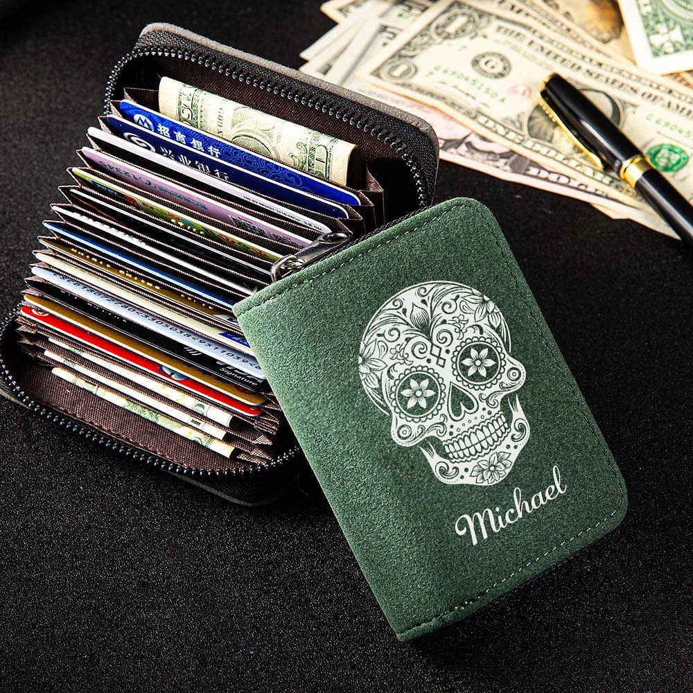 This compact wallet features a striking skull design, Personalised with a name, inspired by traditional facial patterns associated with the Day of the Dead celebration. The intricate details of the skull design make it a distinctive and edgy accessory for men who appreciate unique and bold styles, adding a touch of mystique and cultural significance to their everyday carry.
