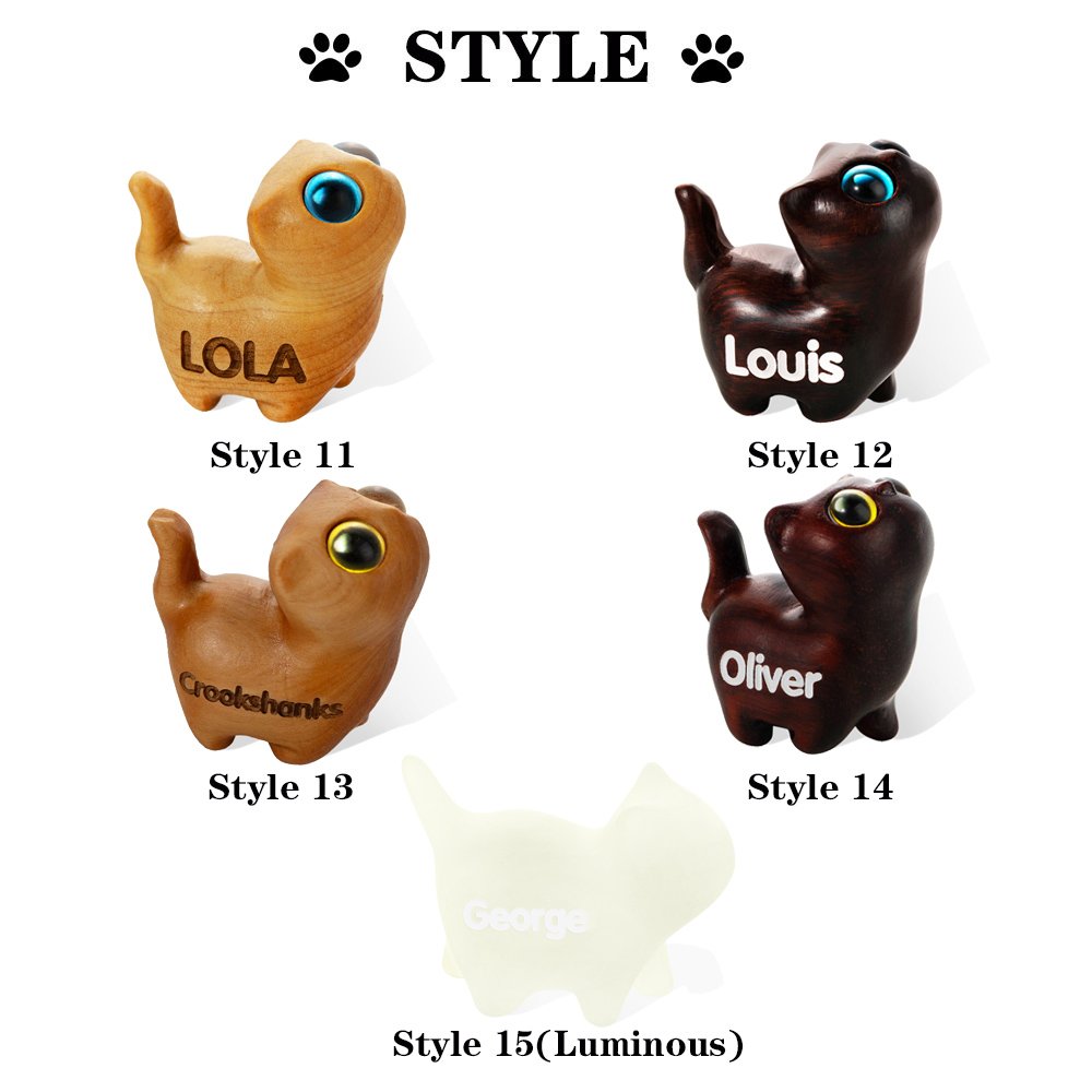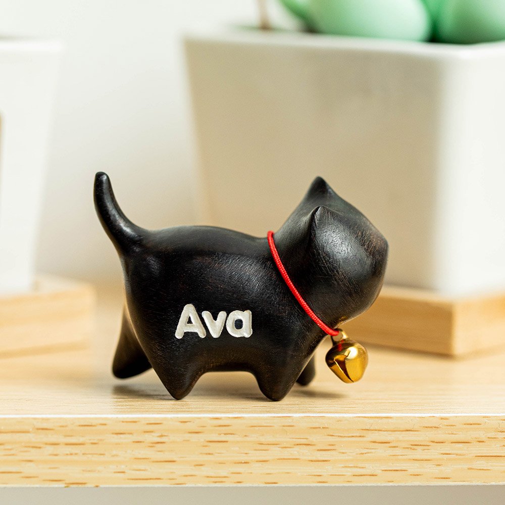 The cat wooden statue has been expertly carved to capture the playful spirit and graceful demeanor of our beloved furry friend. You can add a name to the right side of the cat's body. Whether it's sitting on a desk, or a shelf, or snuggled up amongst your home's flora and fauna, this adorable cat statue will add a touch of whimsy and coziness to your space.